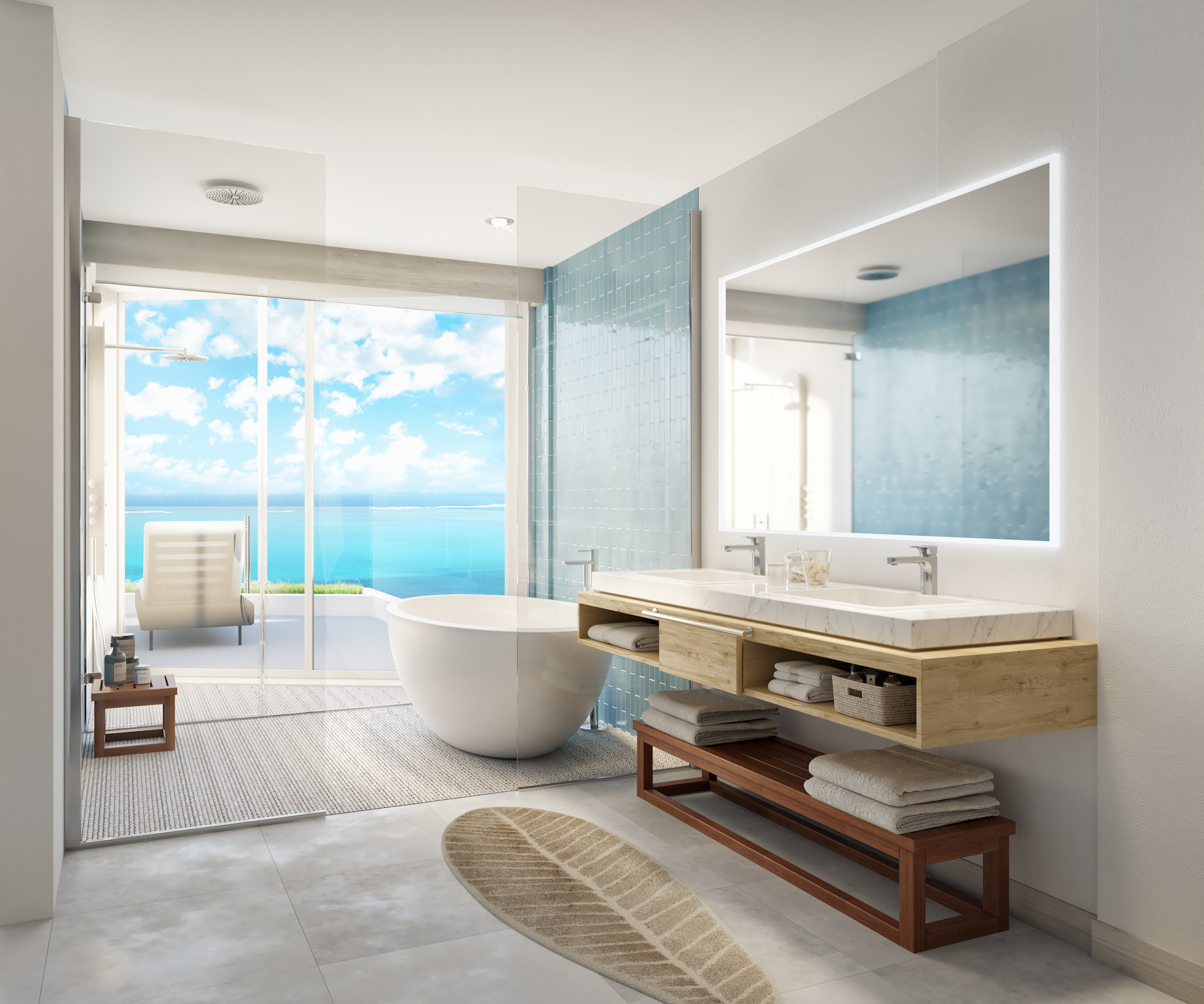 The one-bedroom unit is 1,281 square feet and the master bathroom has an enclosed wet room overlooking the Caribbean, a free-standing deep soaking bathtub, and spa-inspired porcelain mosaic tile floors and walls. It is listed for $1,295,000.