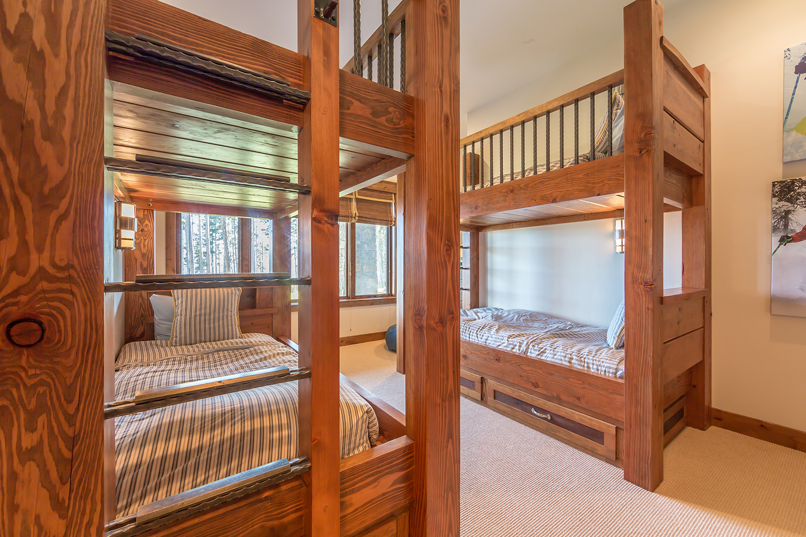 Two separate bunk rooms, each with sleeping space for at least four people, guarantee accommodations for even the largest gatherings. These bedrooms share a deluxe version of the jack-and-jill bathroom, with double sinks and spacious facilities. This bathroom transitions into a dressing room which then opens outside to the hot tub area, making it even easier to soak outside on winter nights.