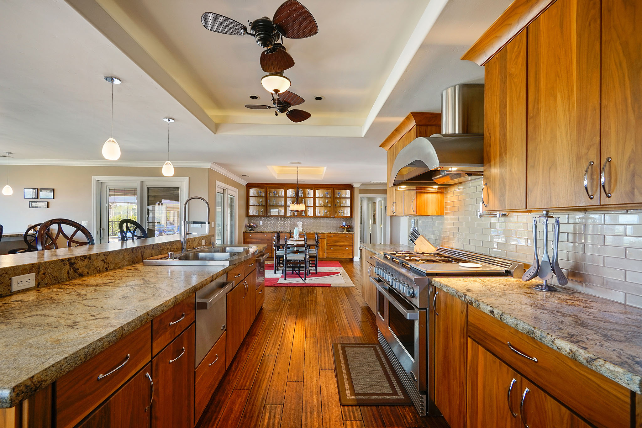 The gourmet kitchen has custom walnut cabinetry, leather look granite and a walk-in pantry with built-in shelving.