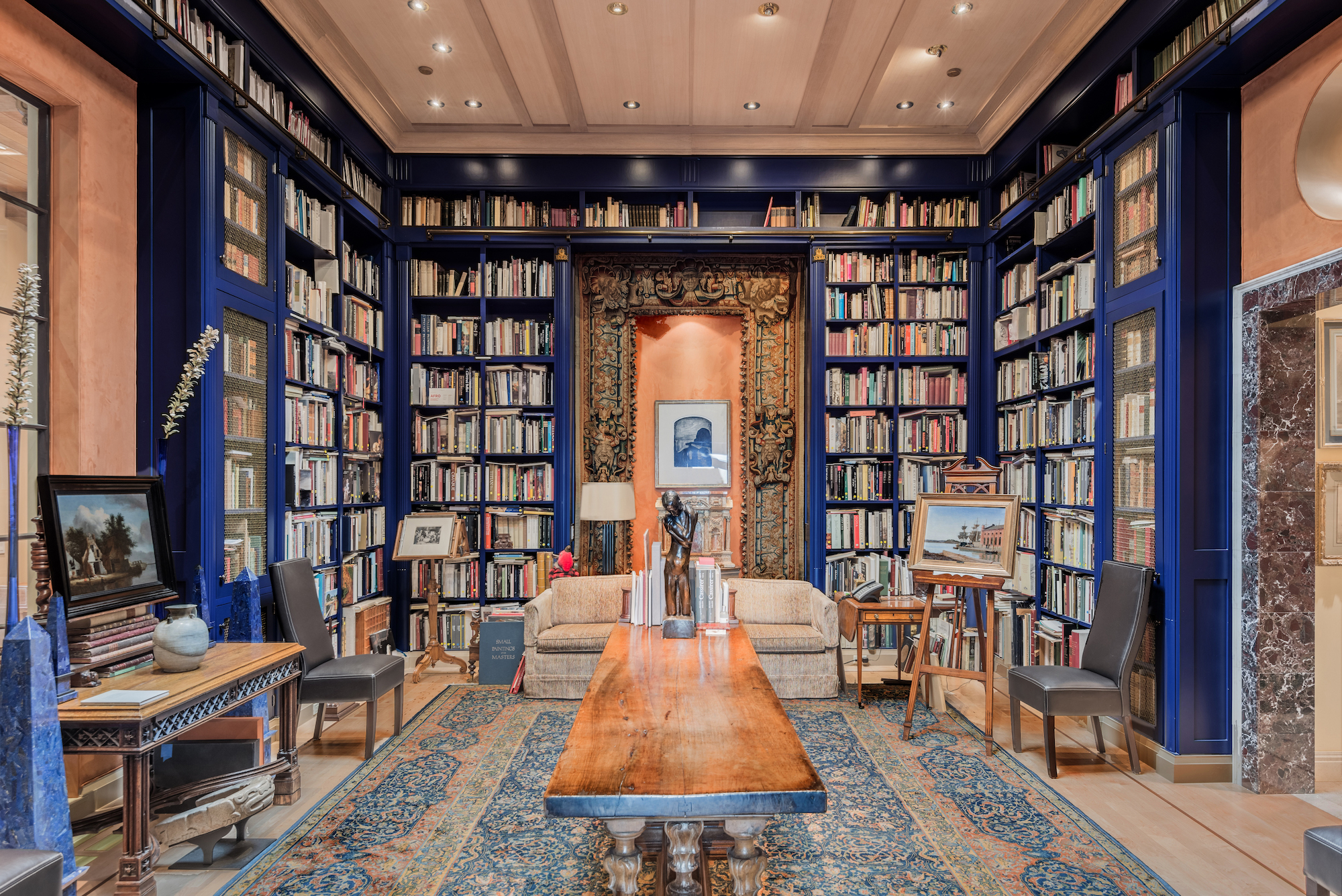 At the center of the home, the stunning library is a welcome retreat. Its ceiling soars to a height of 15 feet and is topped by a six-foot-square skylight that illuminates every inch with filtered natural light. The ambiance is one of Old World meditation, furthered by four walls of floor-to-ceiling bookshelves and an exquisitely carved late-18th-century Adam-style doorway.
