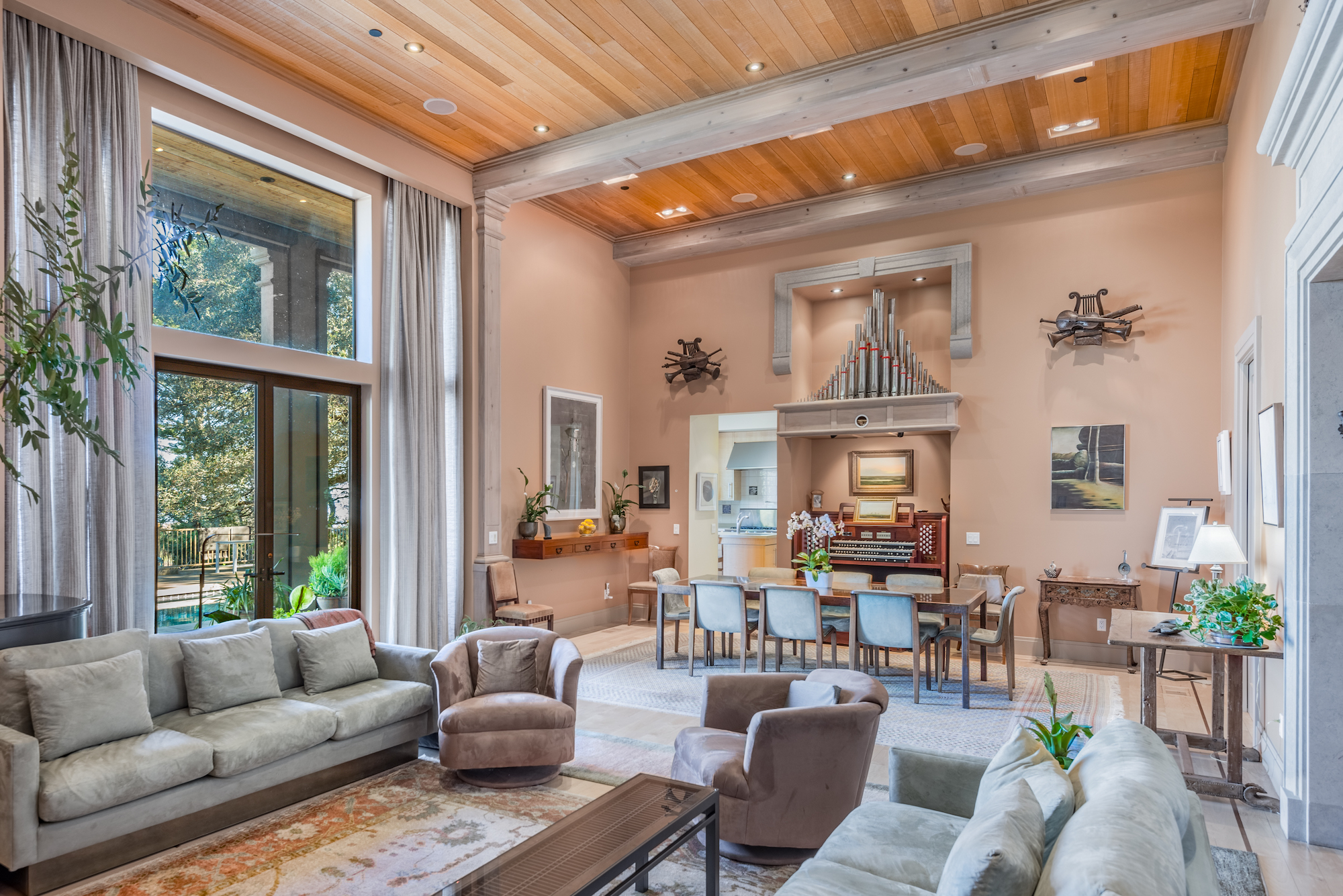 Many rooms are part of a soothing flow where an object of art, a window, or a vista pulls the eye forward. A riveting view, naturally obstructed outdoors, reveals itself dramatically indoors, in the main living and dining area. From the western end of the library the eye travels through the hall and the living area toward the breathtaking vista which includes the home’s alluring 50-foot swimming pool. In the tranquil master suite two oculus windows and a window seat encourage a close relationship with the enveloping landscape and gardens. 12-foot ceilings conjure a feeling of airiness and ease.