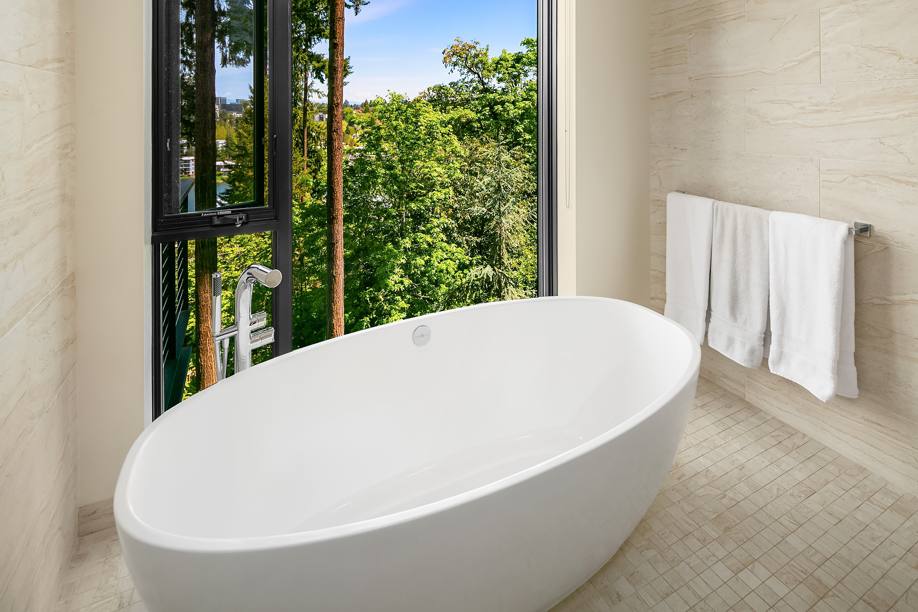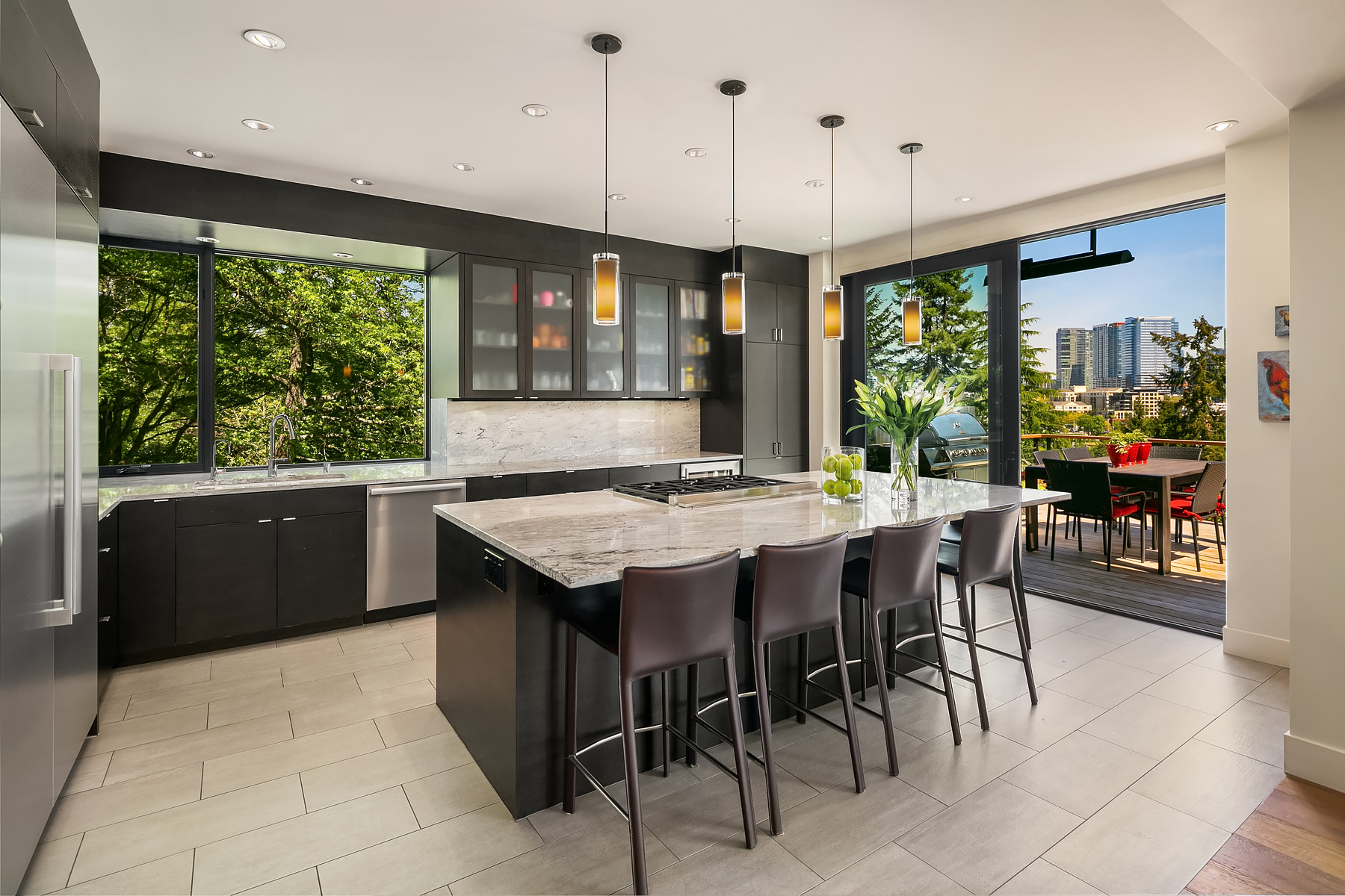 Skyline views are available from many rooms. The kitchen has Miele and Thermador appliances.
