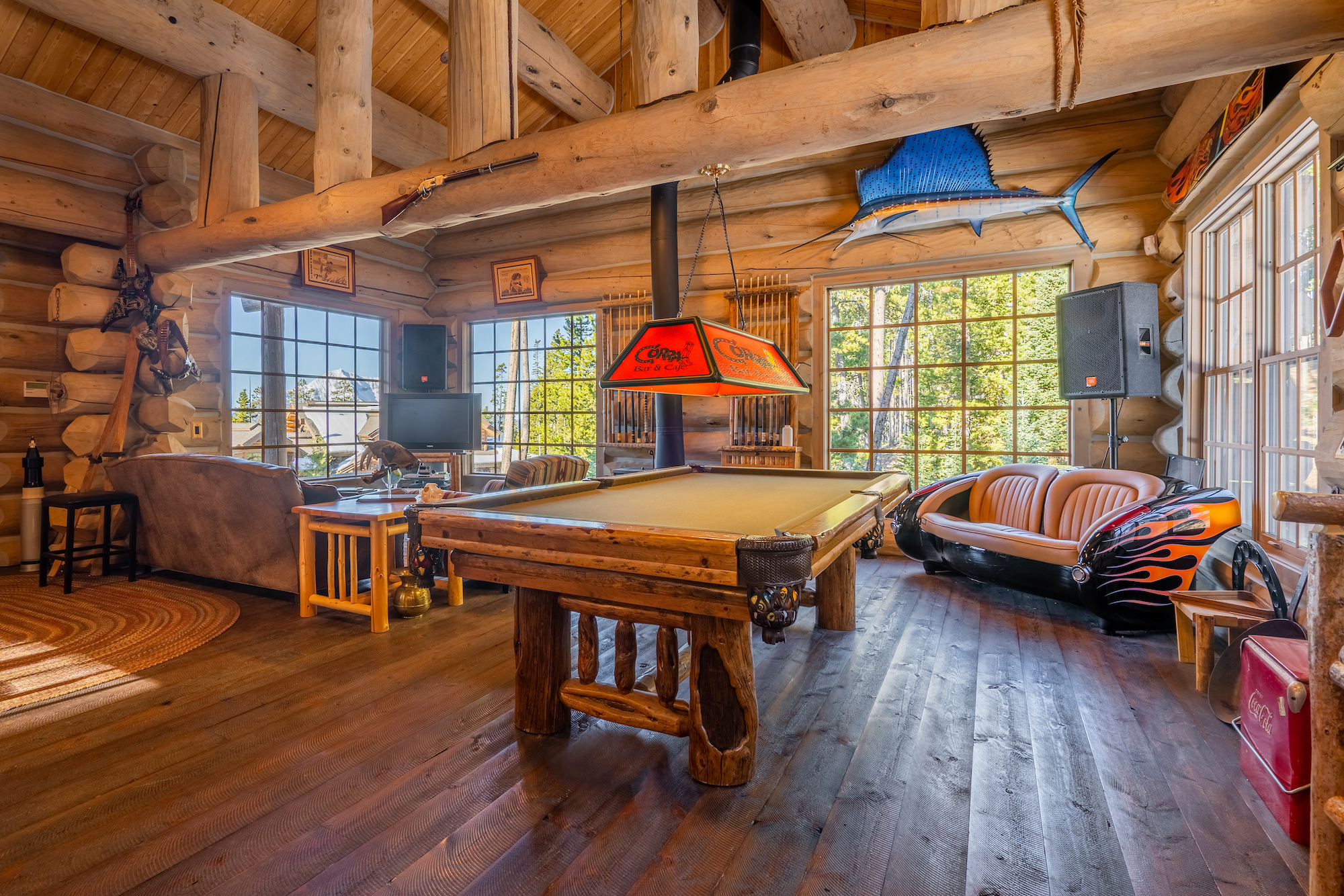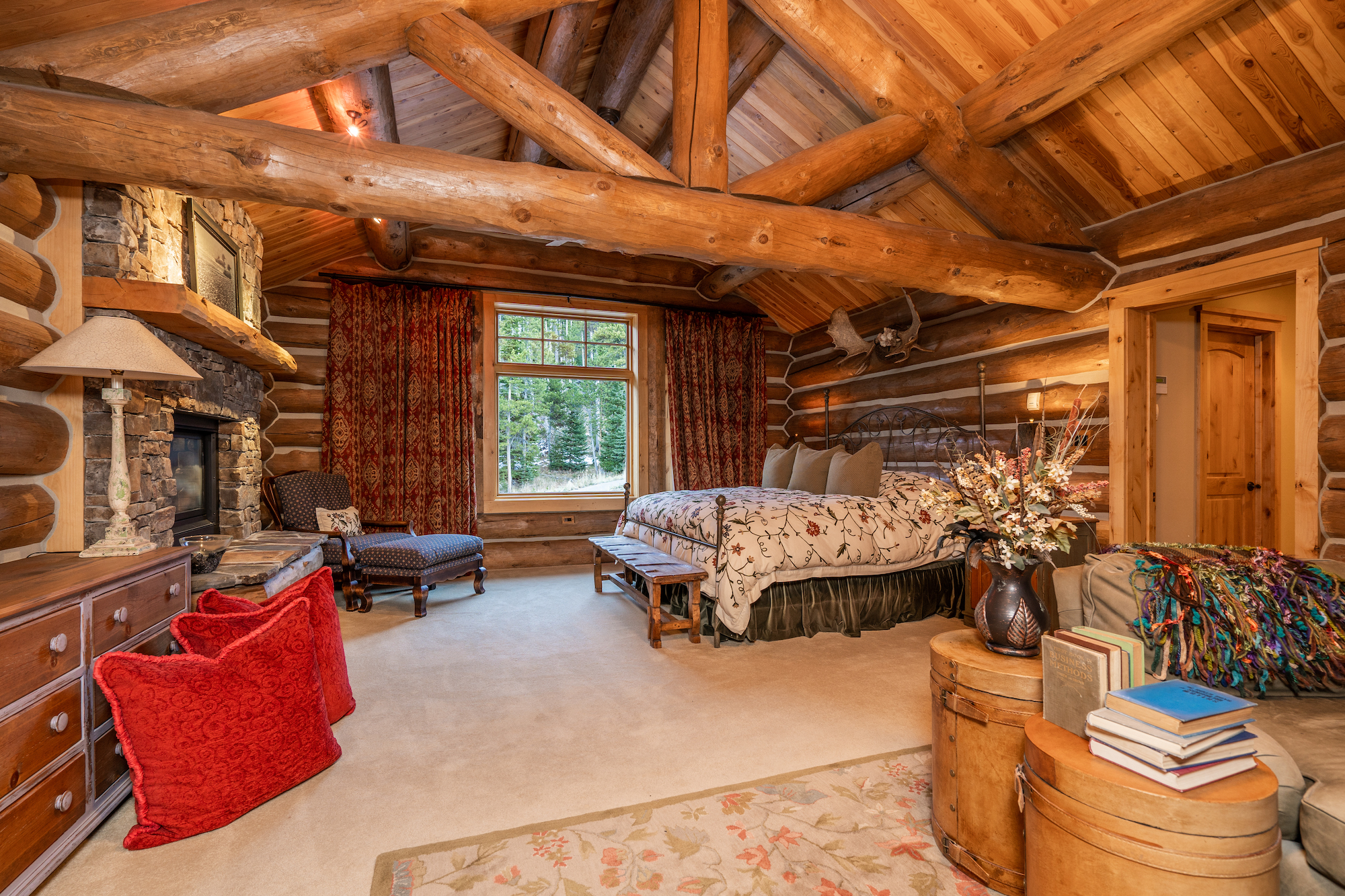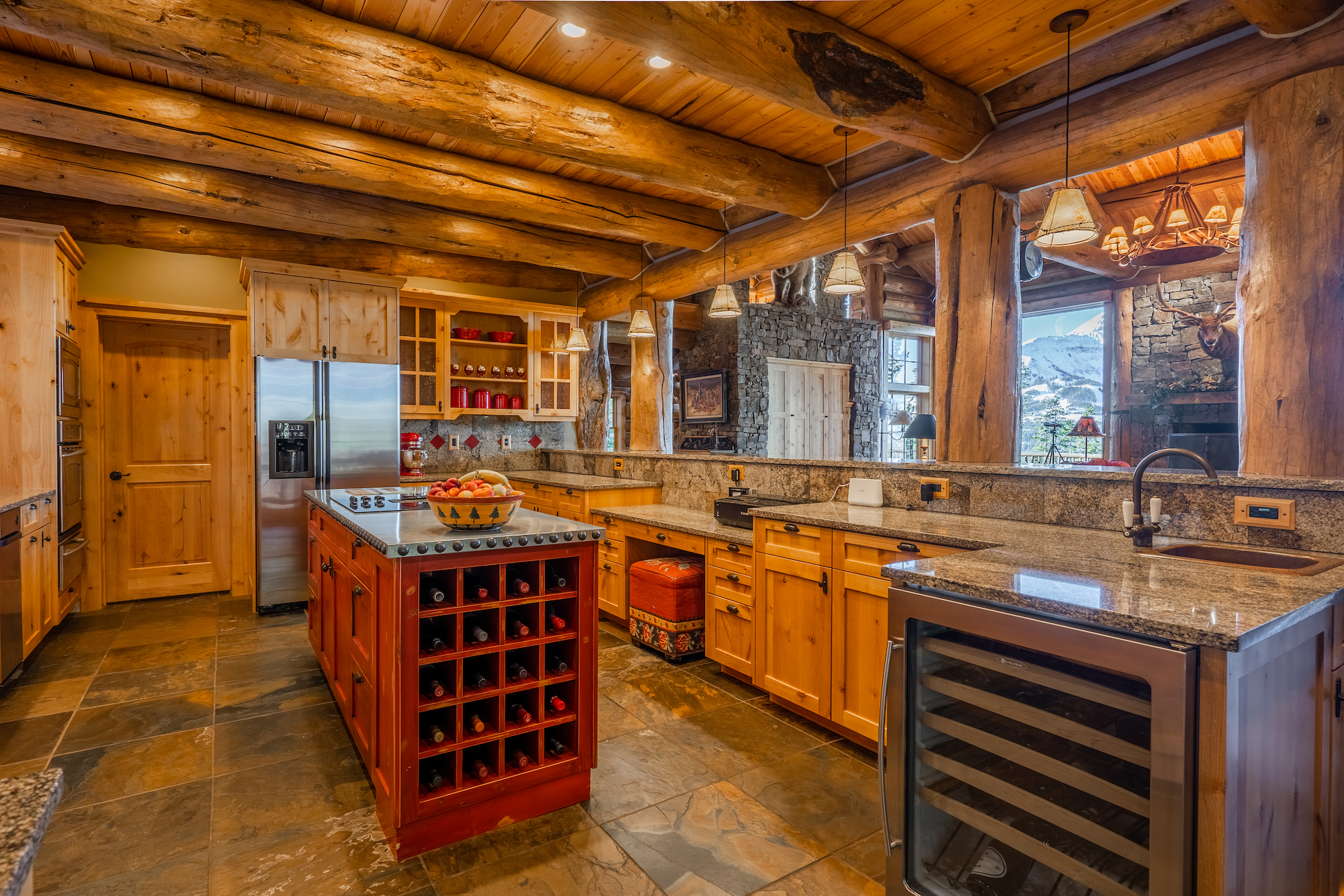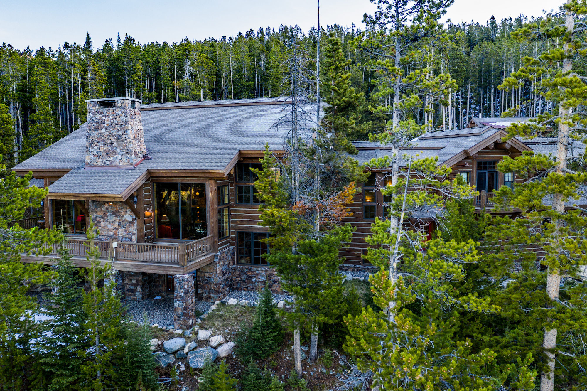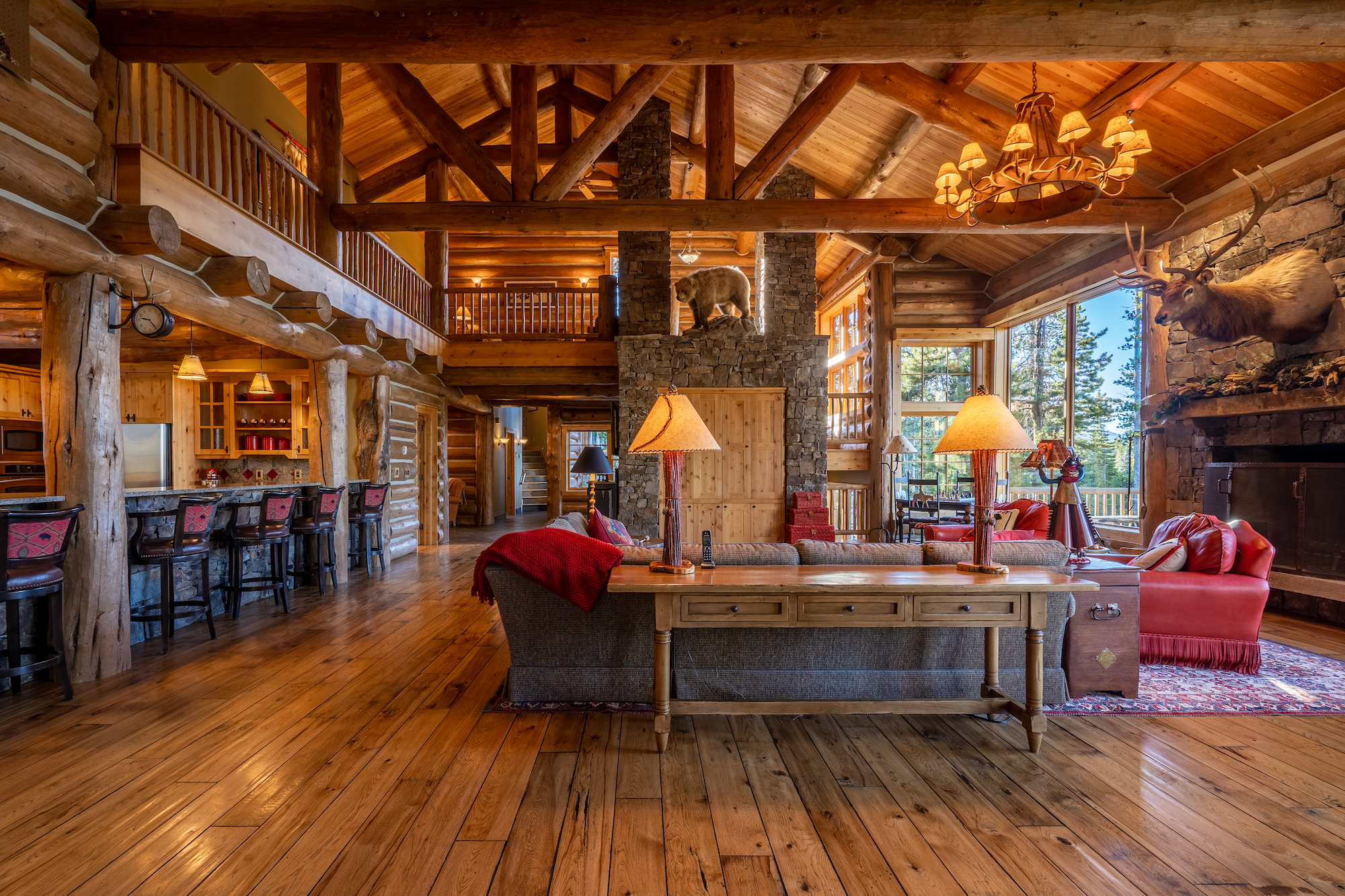 The interior of the home is an elevated log cabin style with large fireplaces and rustic stone.