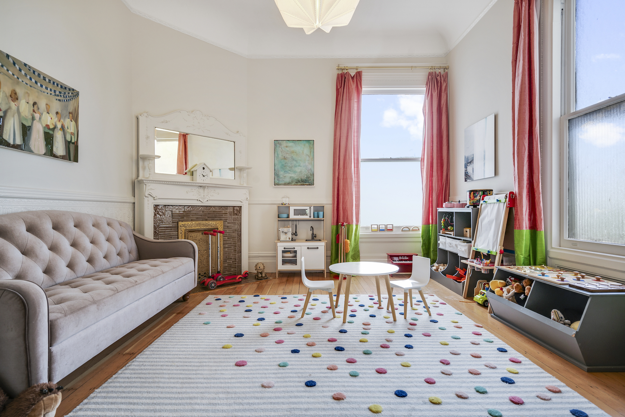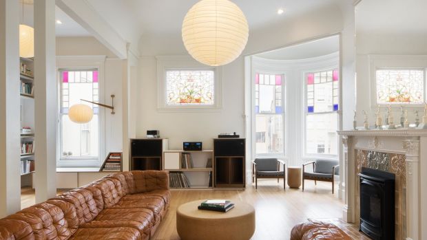 The penthouse — redesigned in 2017 by architects Bohlin Cywinski Jackson, the designers behind many Blue Bottle cafes — builds on the home’s original lines, modernized with blonde woods and light surfaces. The home features an open floor plan with original stained glass and fireplace. A modern, floating wall library of laminate bookshelves and exposed plywood edges was fabricated by Tomlinson Woodworks. The chef’s kitchen enjoys natural light, with white Corian counters, custom powder-coated aluminum shelves and a WallyGro by WoolyPocket greens wall with automatic watering and lighting integration.