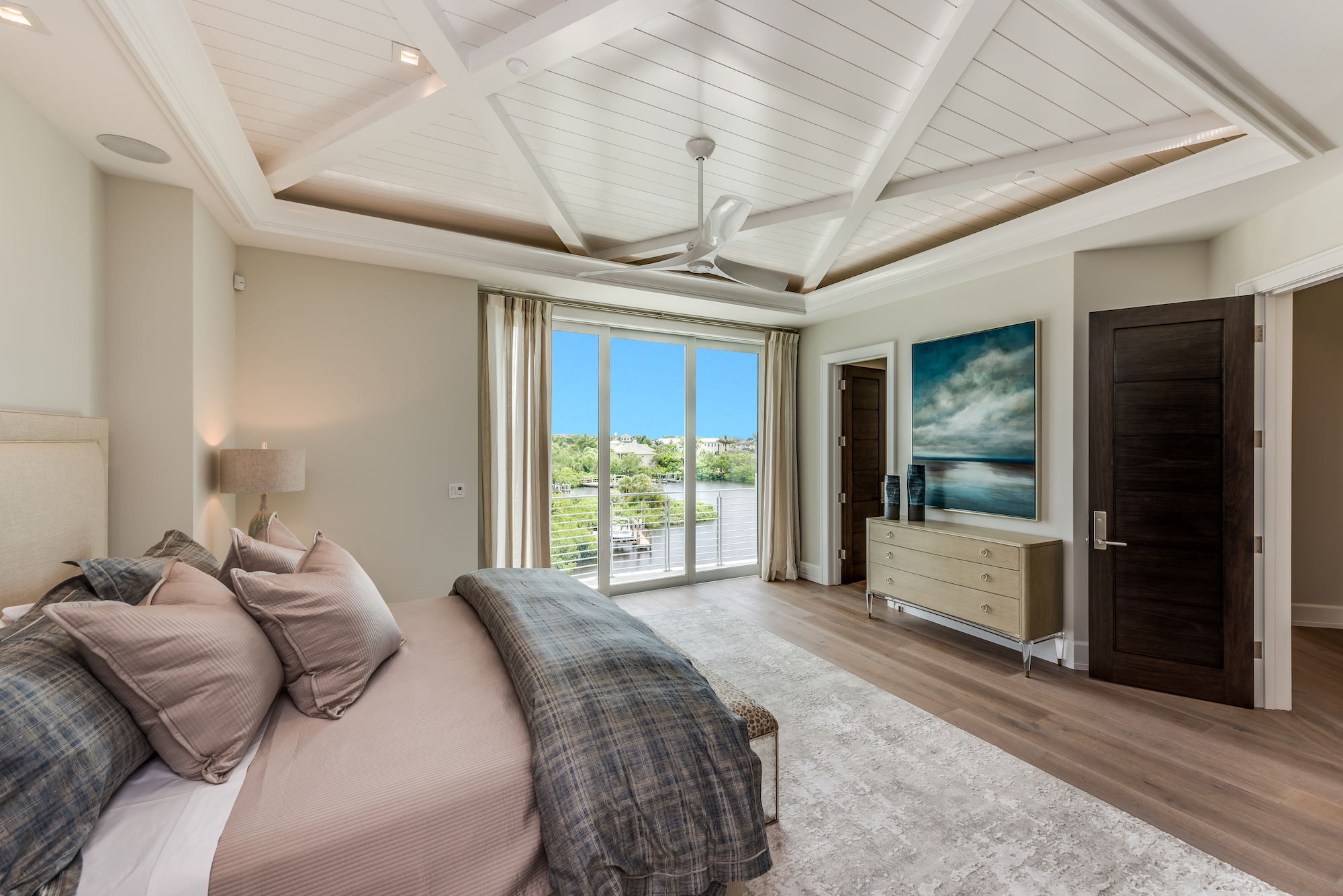 The coastal sophistication of this entire home was directed by Ficarra Design Associates and reflects a sophisticated yet beachy style with neutral tones enlivened by pops of blue.