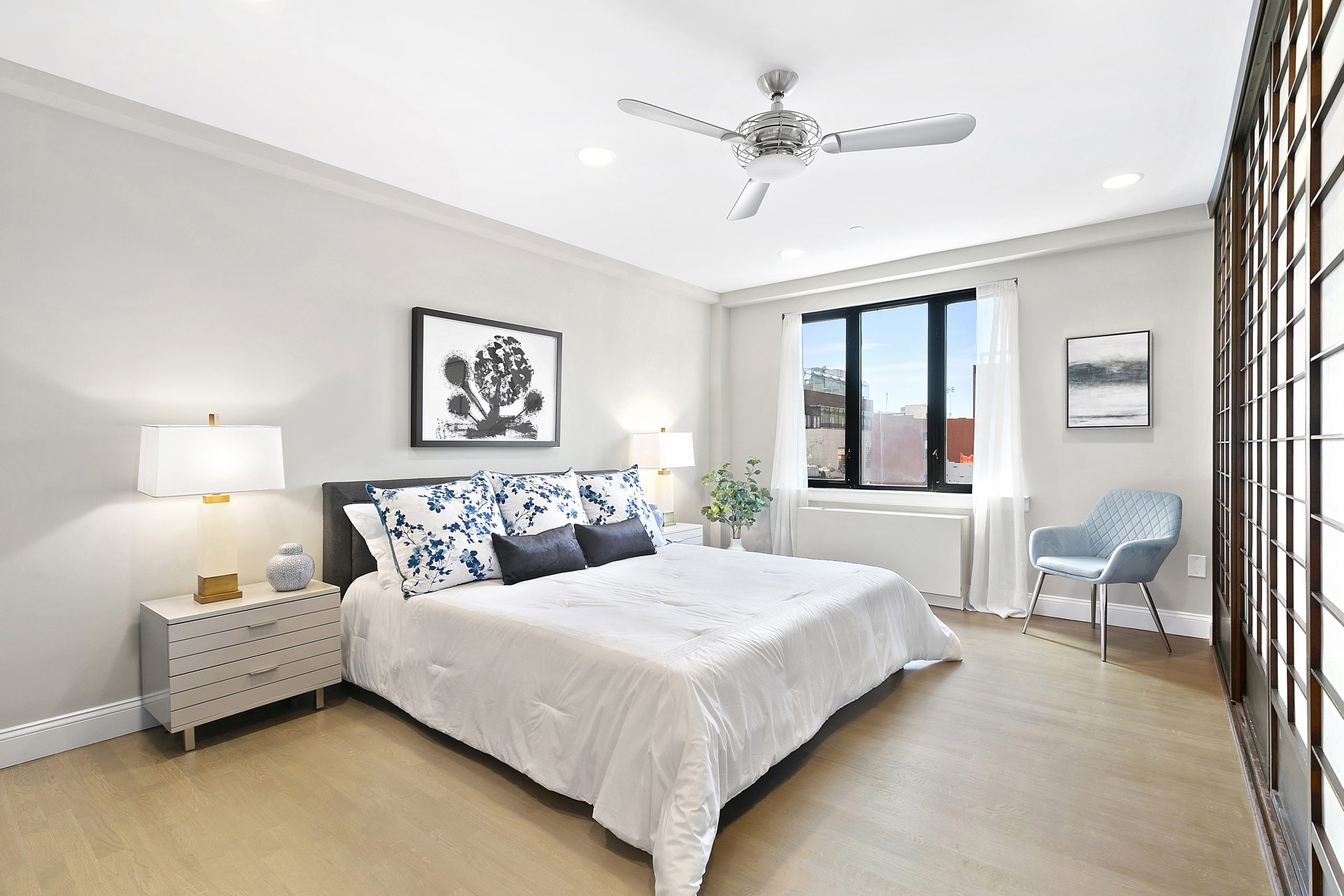 There are brand new hardwood floors throughout the residence and an abundance of closets which are all outfitted with California Closets. The apartment also features architectural lighting, separately controlled AC in each room, and a washer/dryer.