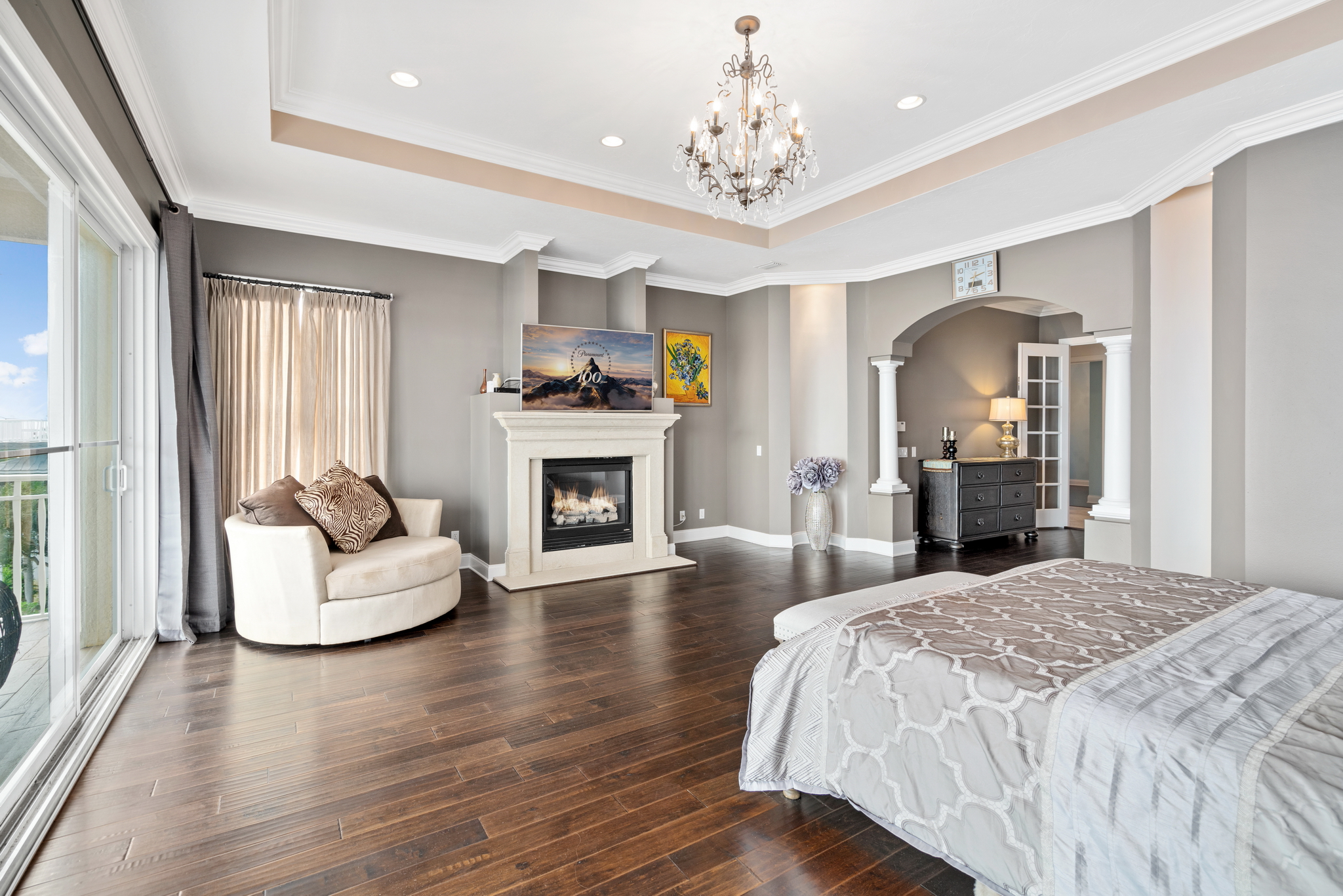 The sumptuous master suite overlooks the Bay with sliding glass doors that disappear and connect with the private viewing terrace while a fireplace gives it an elemental ambiance.