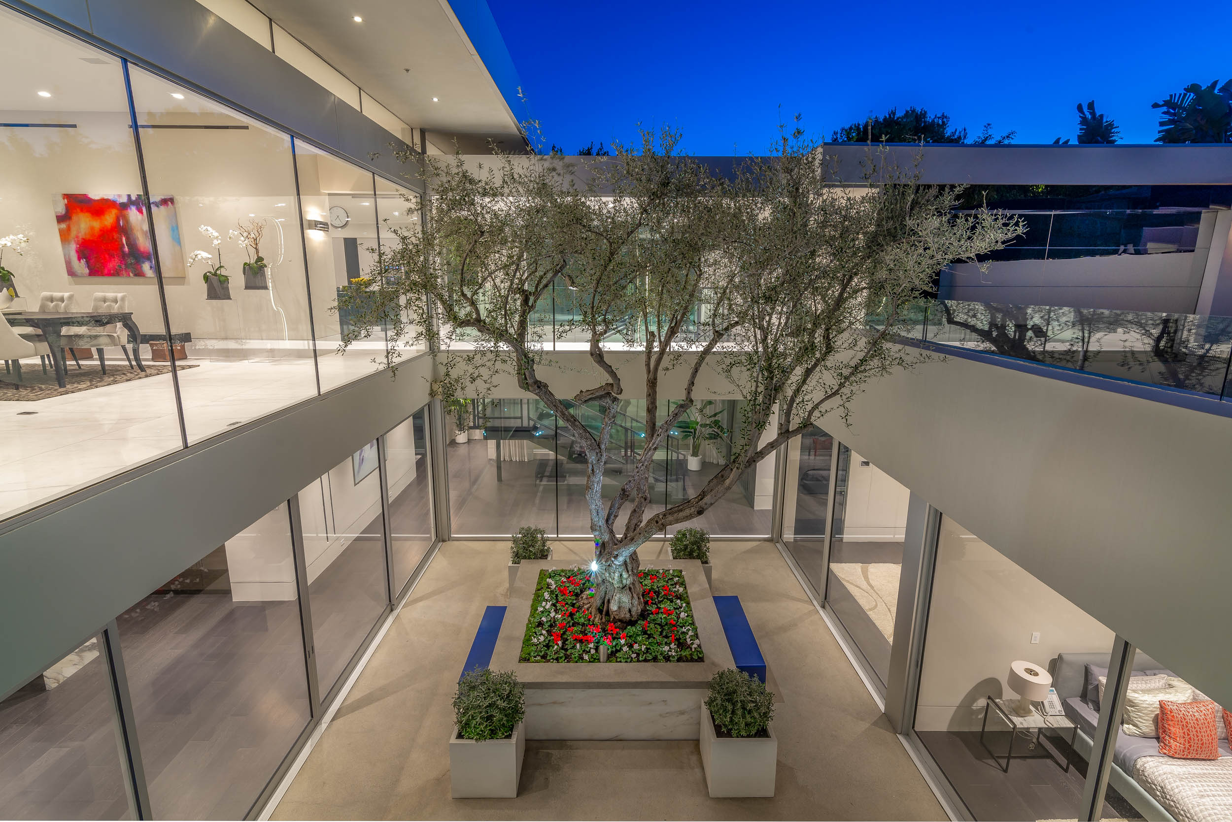 Dr. Chanchai’s modern estate in Beverly Hills’ coveted Trousdale enclave is tucked behind a 12’ glass gate that opens to feature a two-story fountain and interior courtyard with a majestic olive tree.