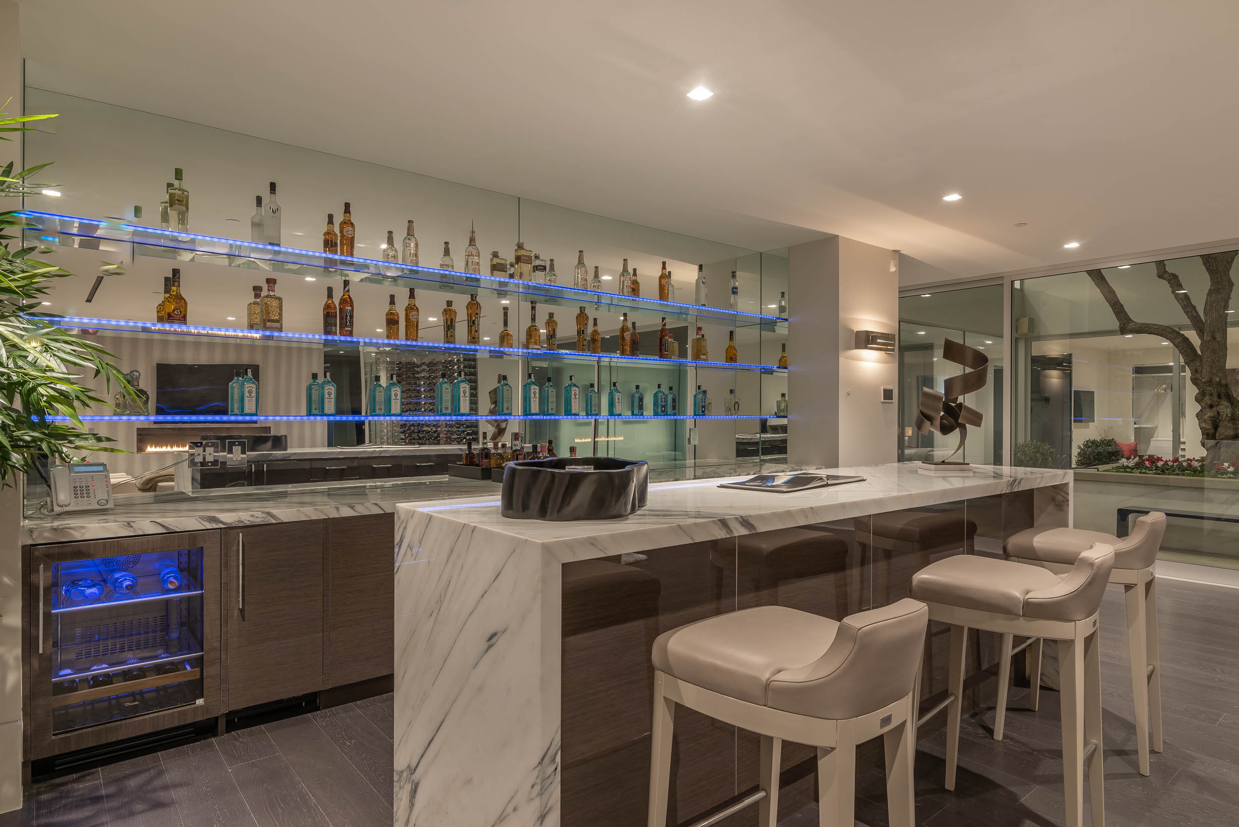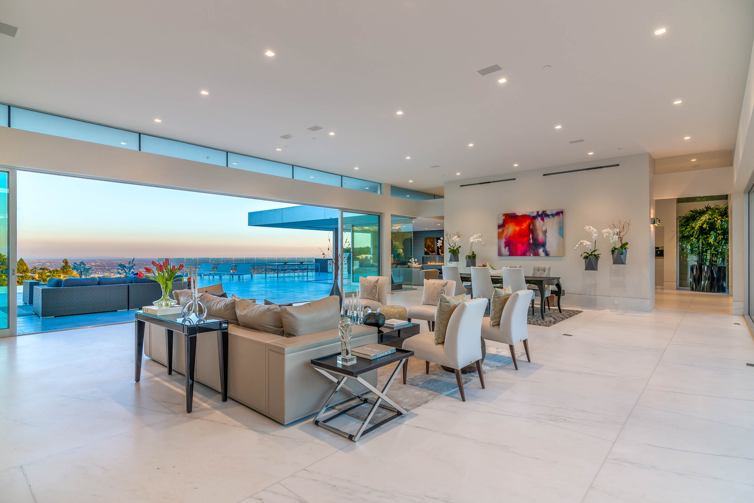 The walls of glass disappear to the outside, offering effortless access to the zero-edge infinity pool, spa and exterior kitchen with a backdrop of views from the city to the sea.