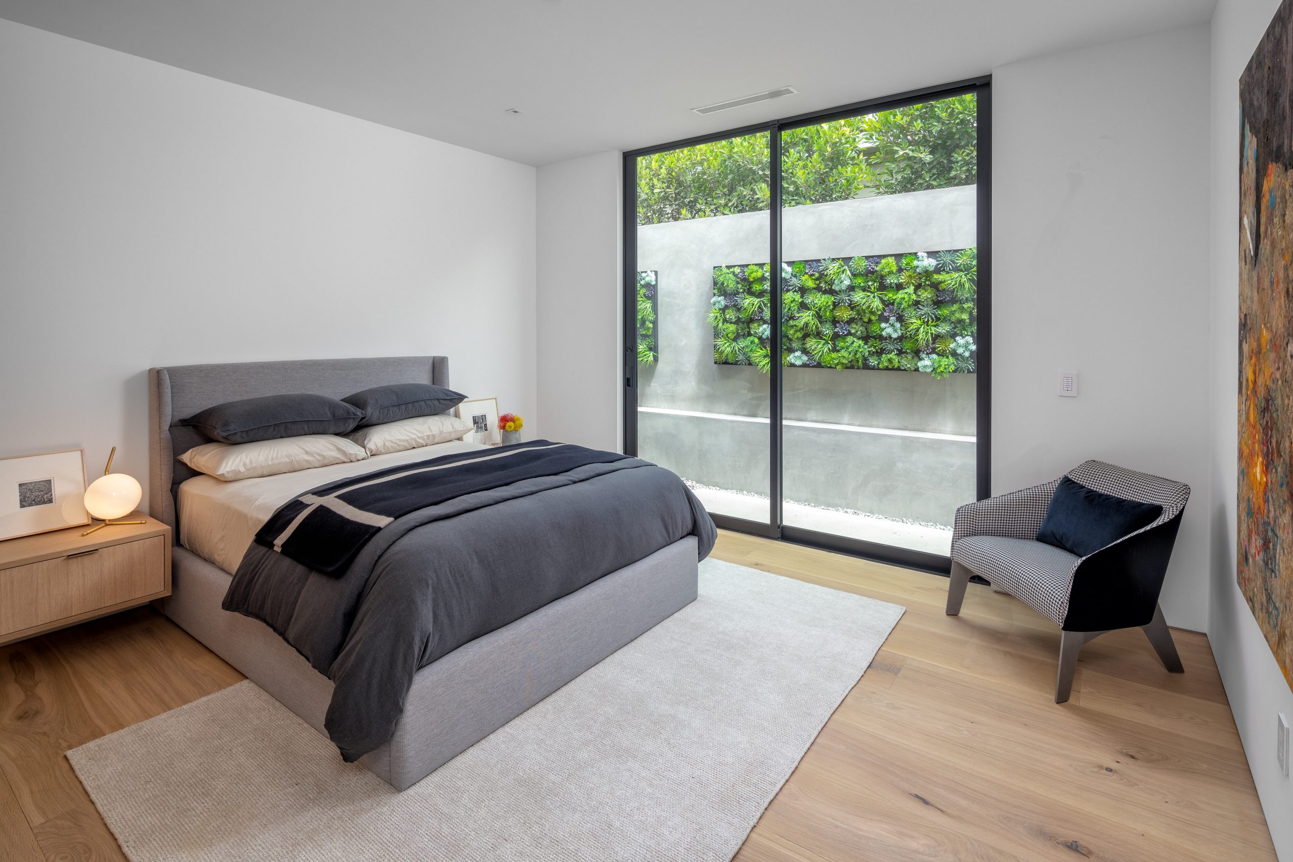 The master suite features custom European white oak flooring, limestone walls, custom walk-in closet and direct access to the pool and spa.