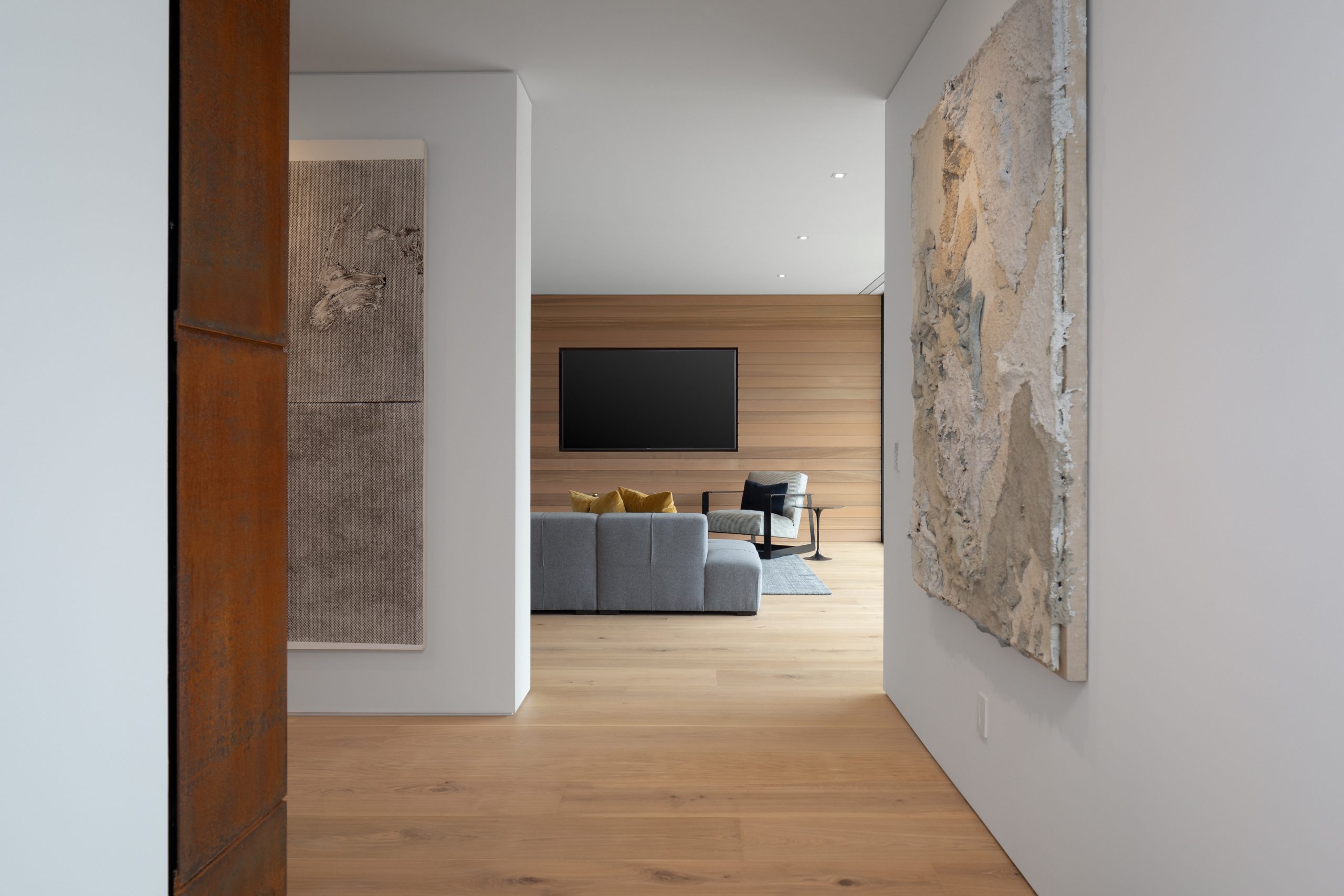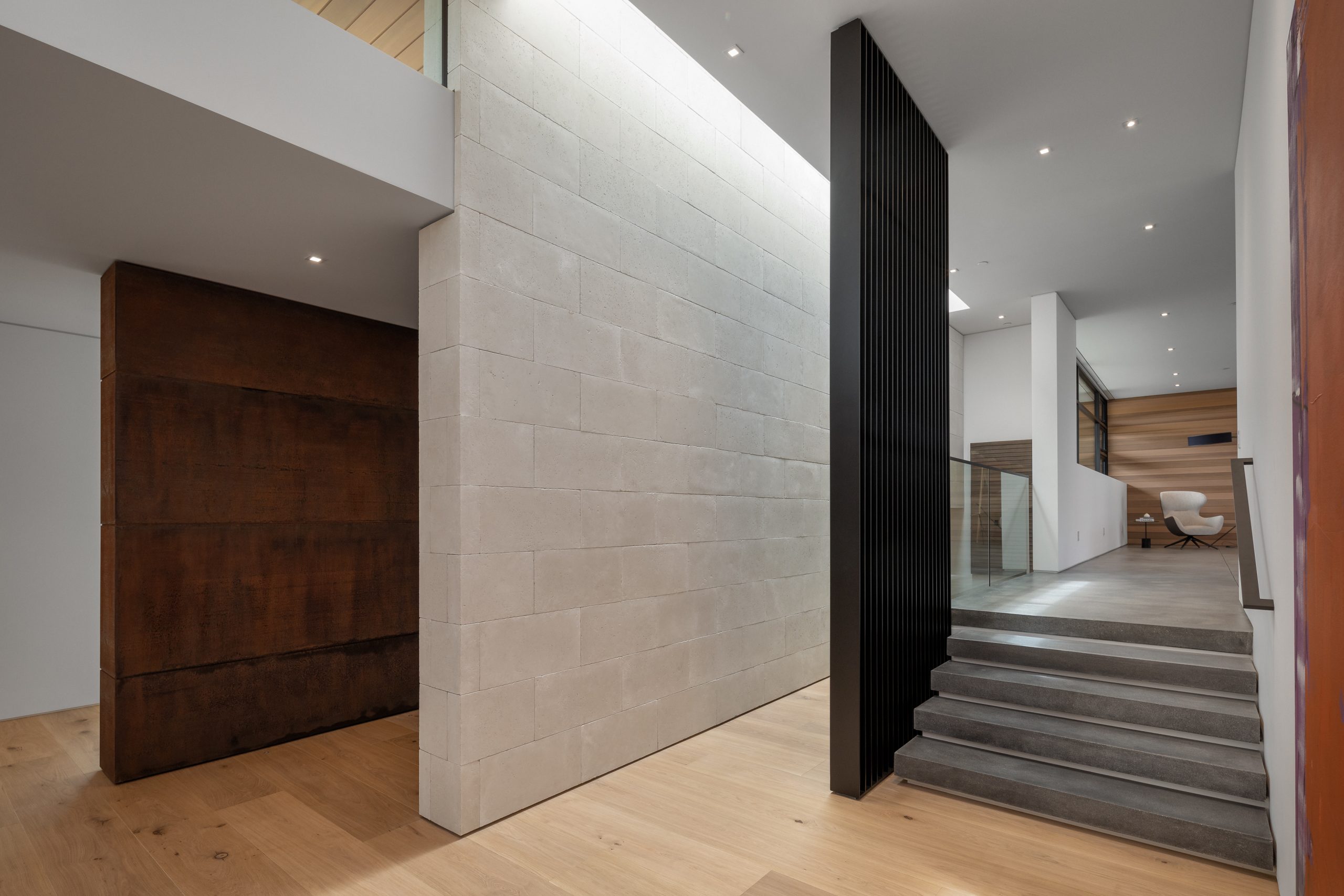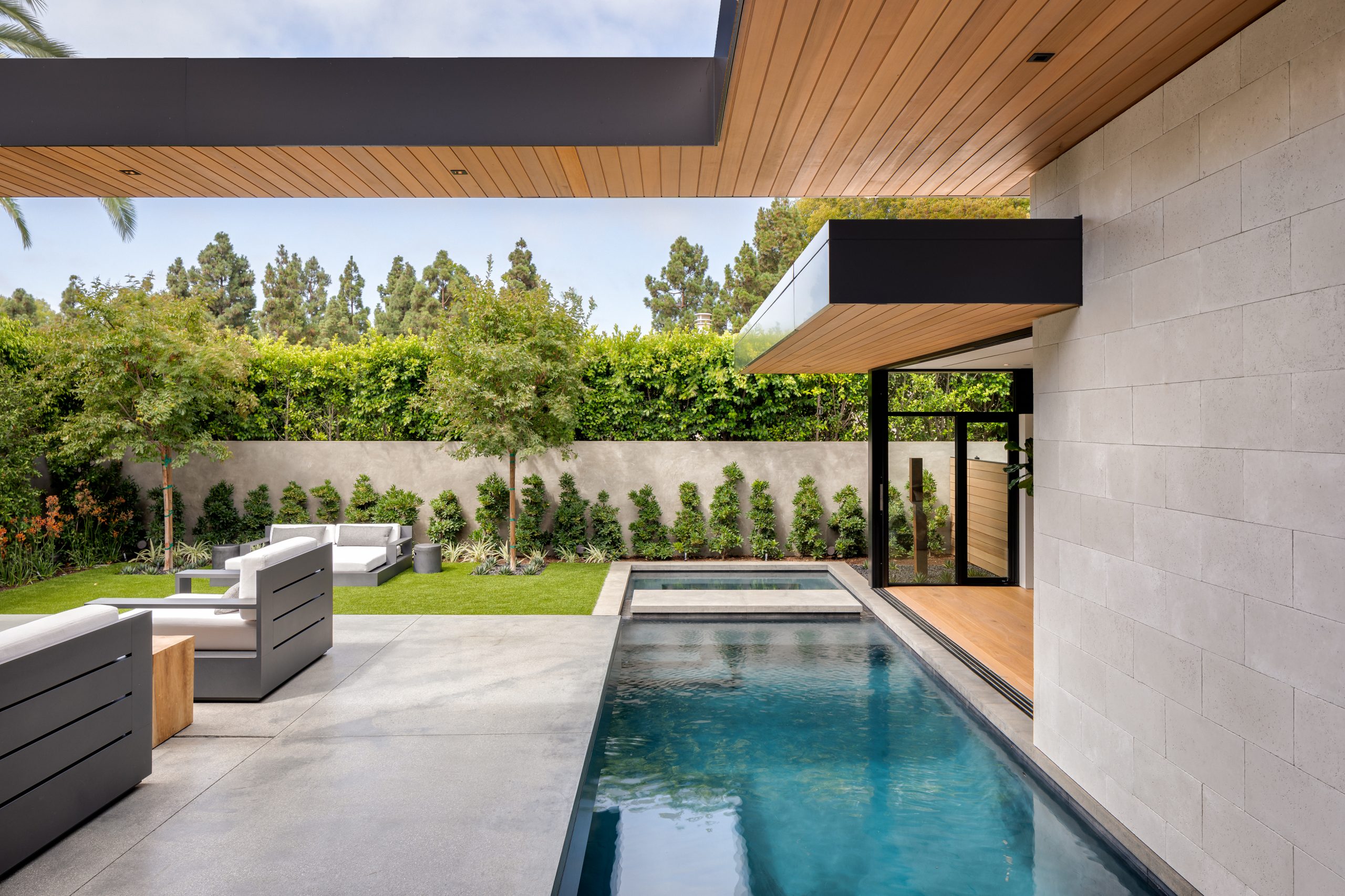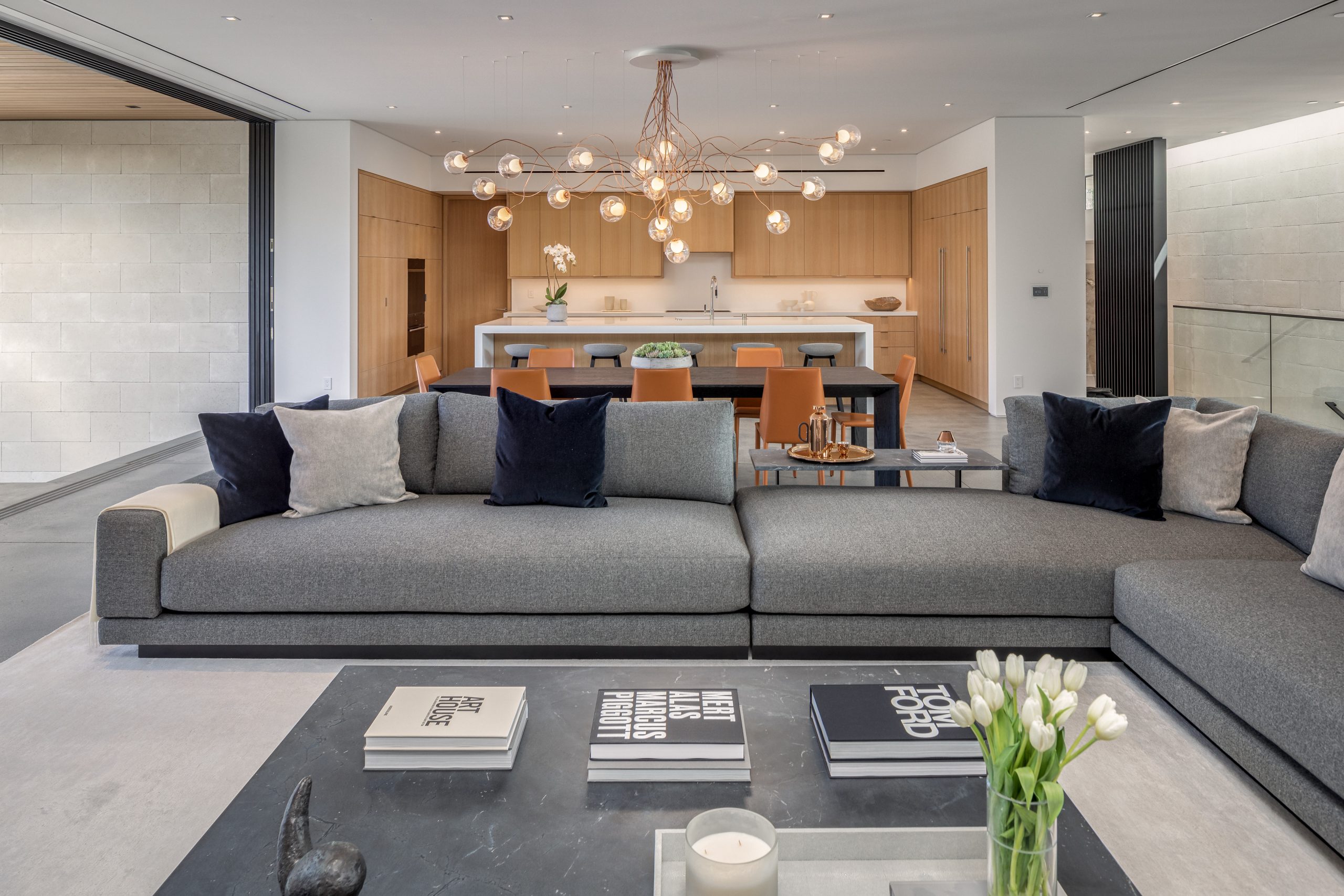 Walls made of retractable glass in combination with skylights throughout provide an influx of natural light, blurring the line between indoors and outdoors.