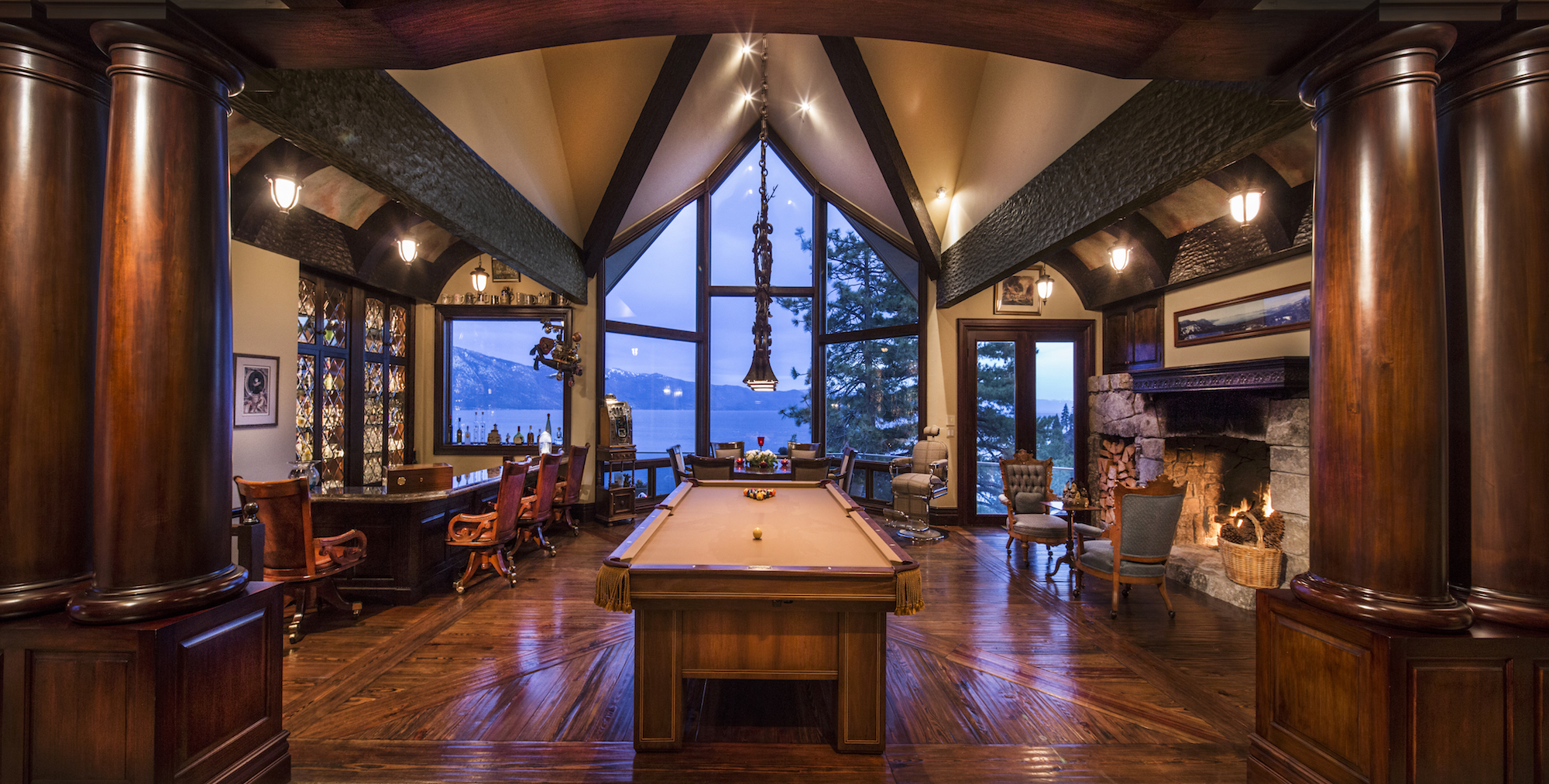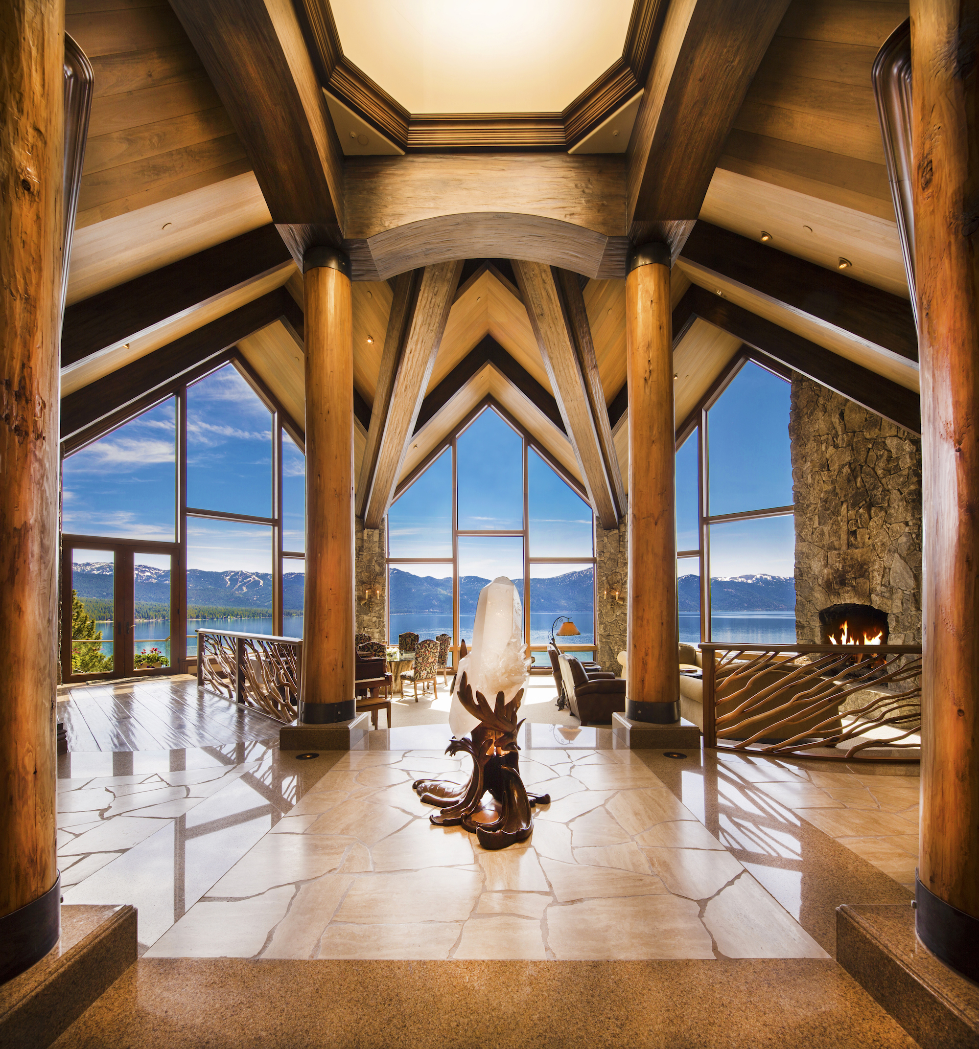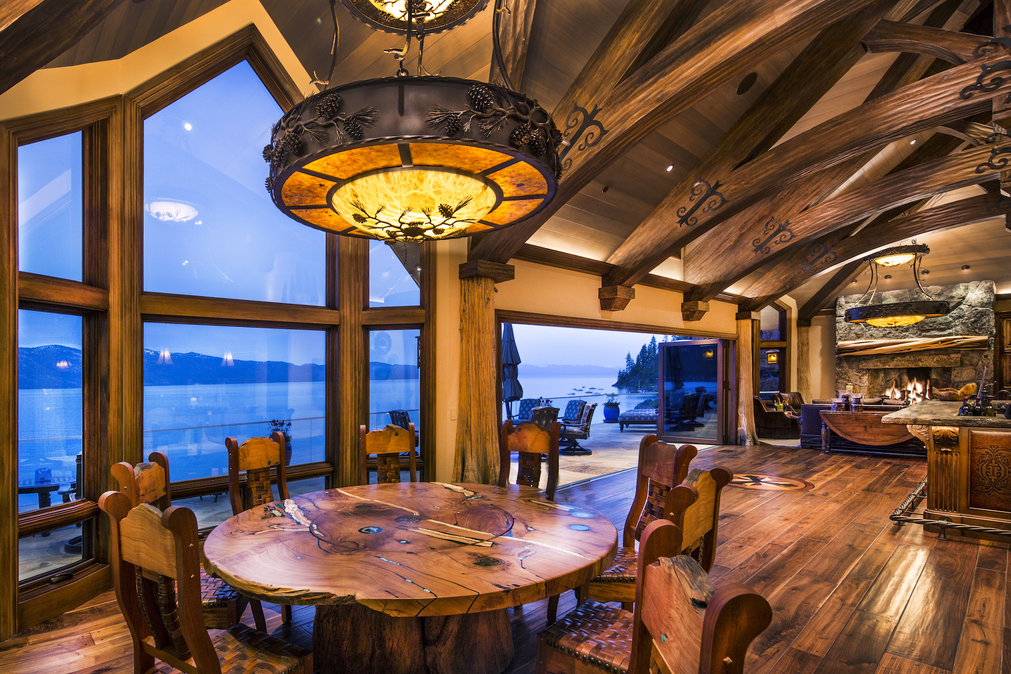 Large stone fireplaces provide central gathering places and provide a counterpoint to the lake views.
