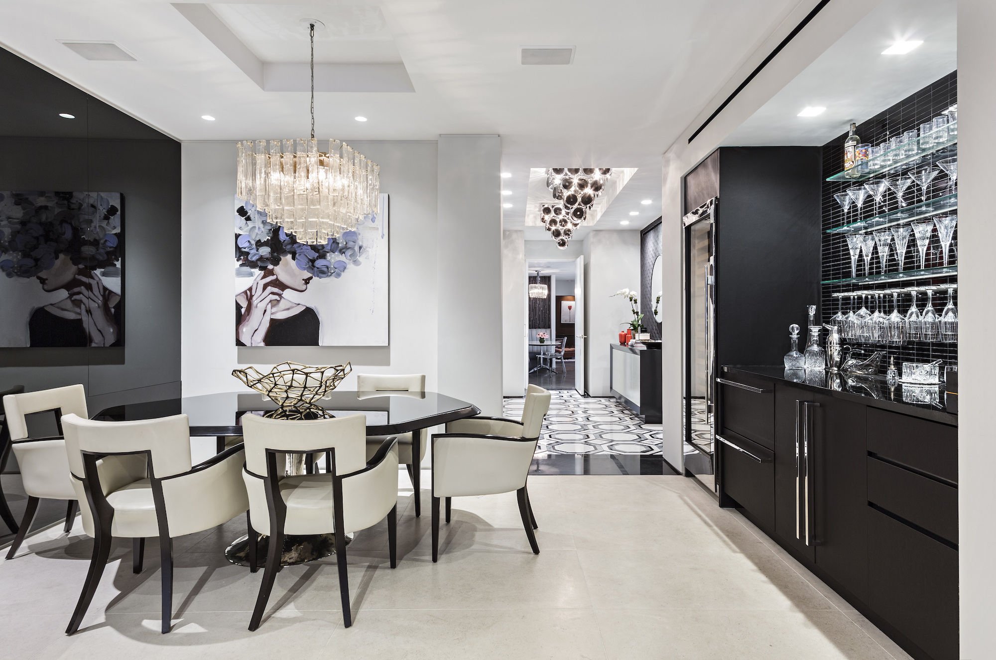 Enter from a dramatic foyer and entertain in the grand scale living/dining room with gorgeous oversized windows, planting terrace, a wood burning fireplace as its centerpiece, and featuring an artfully designed bar with 132-bottle Sub-Zero wine refrigerator.