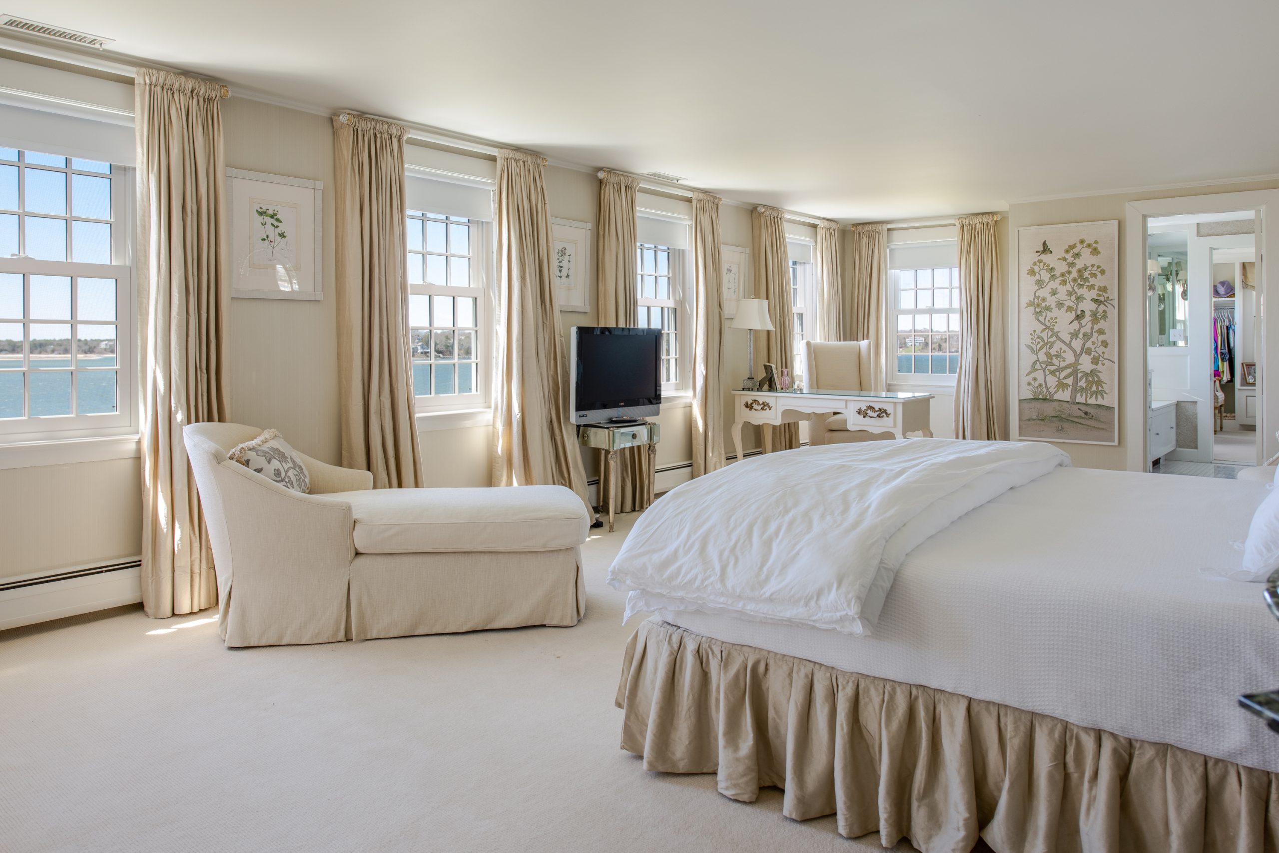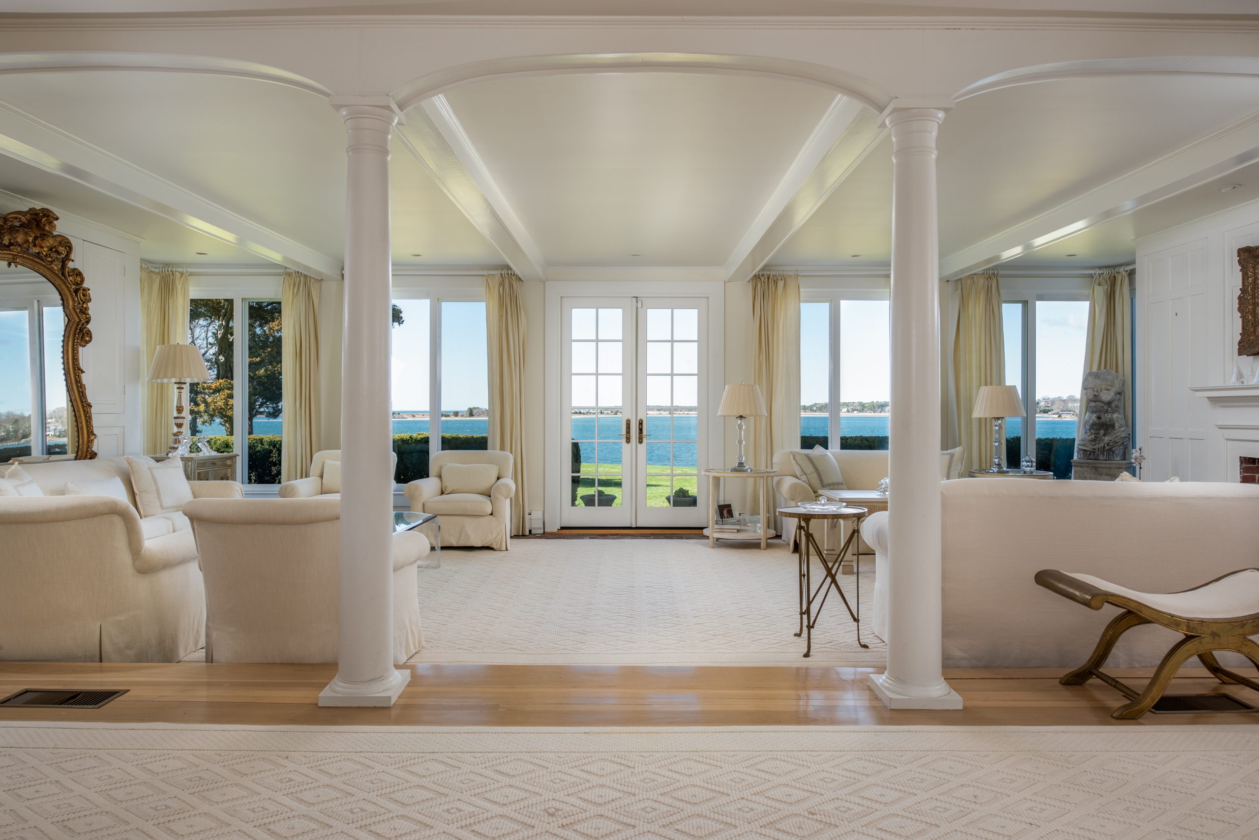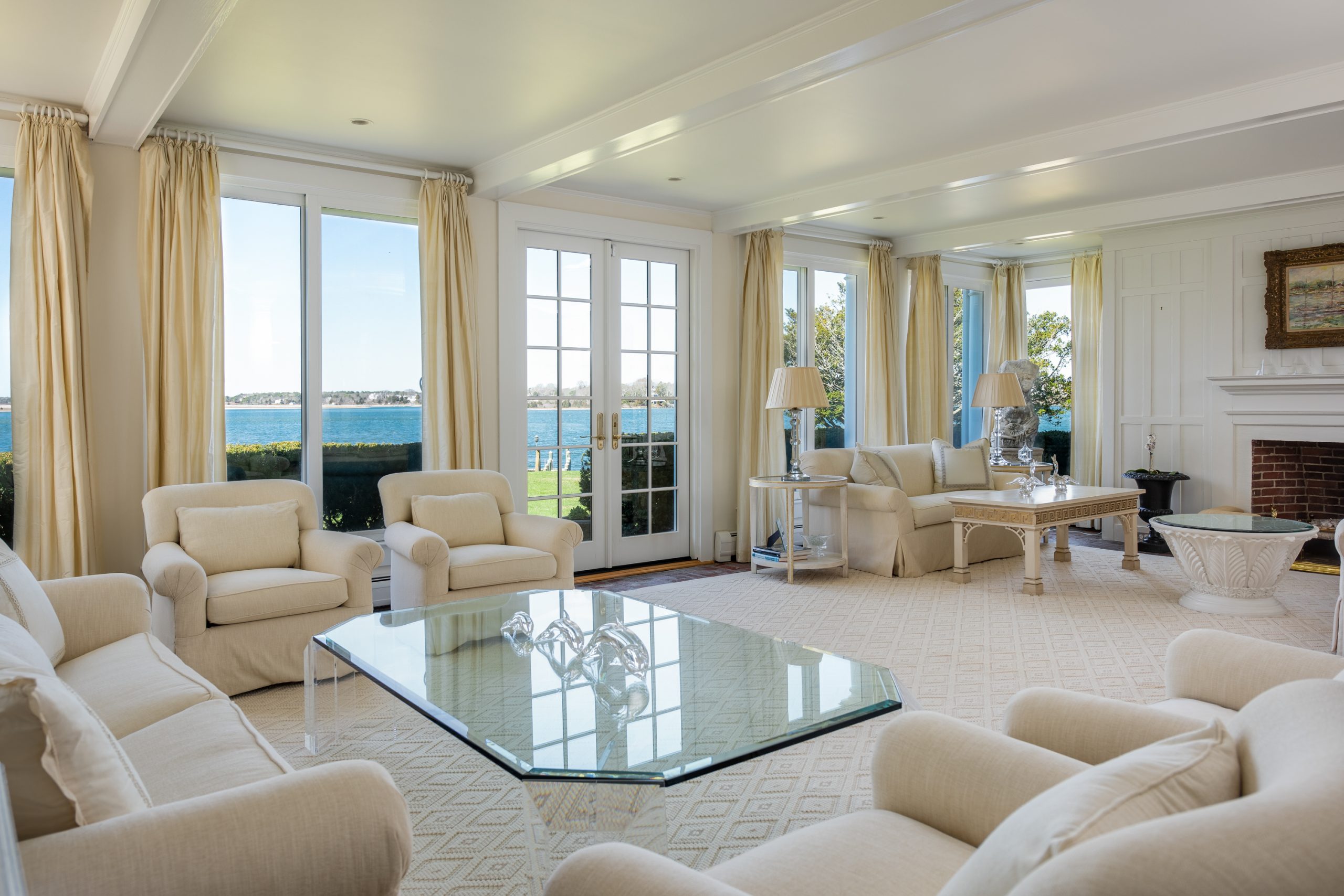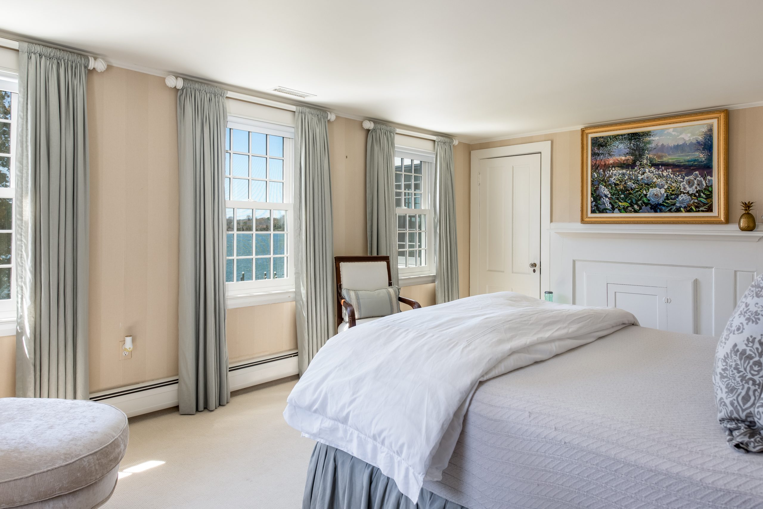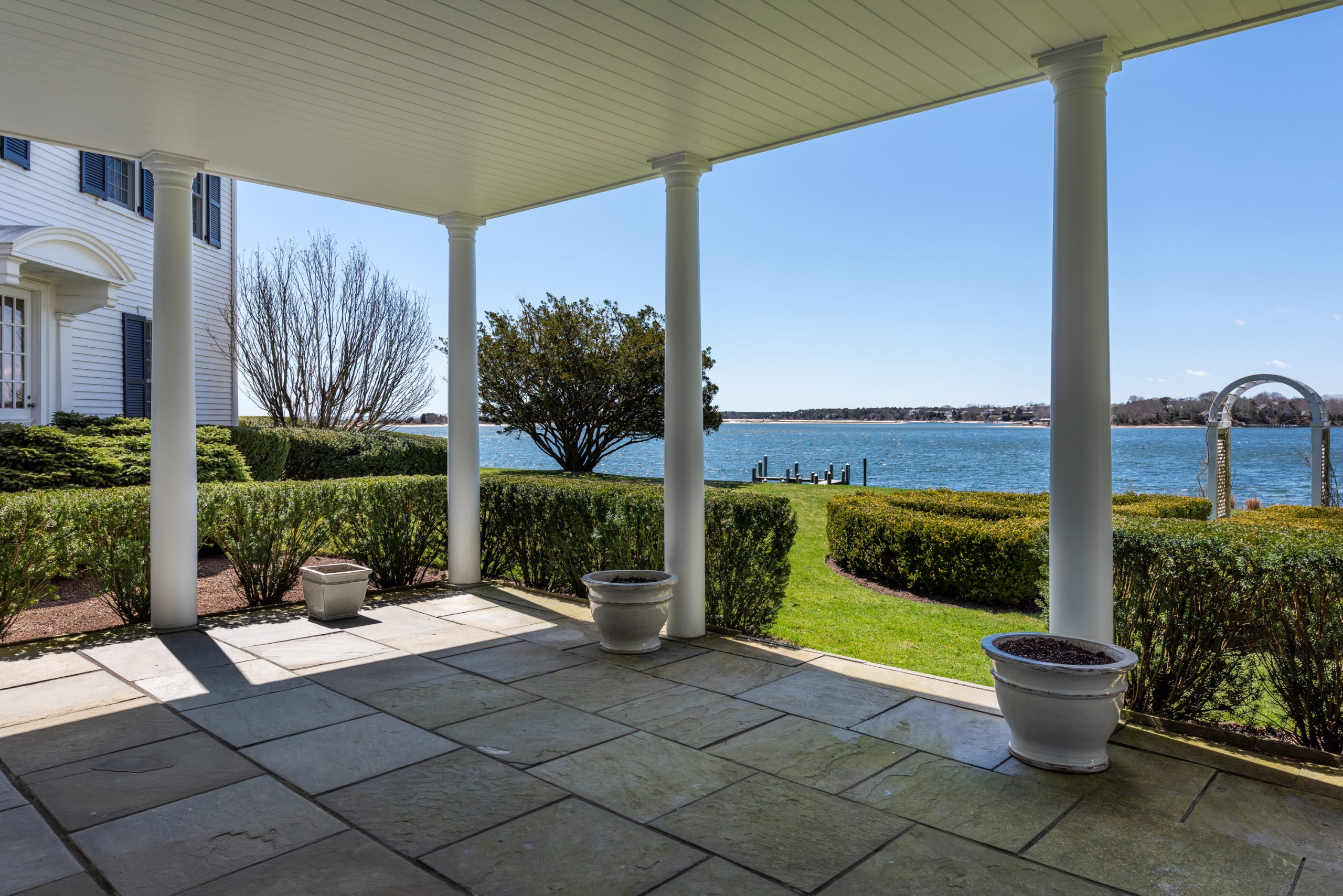 The property has stately manicured grounds include sweeping lawns on all sides, a rose garden, gated swimming pool, and a wooden staircase along the breakwater down to a deep-water dock large enough for a substantial yacht.