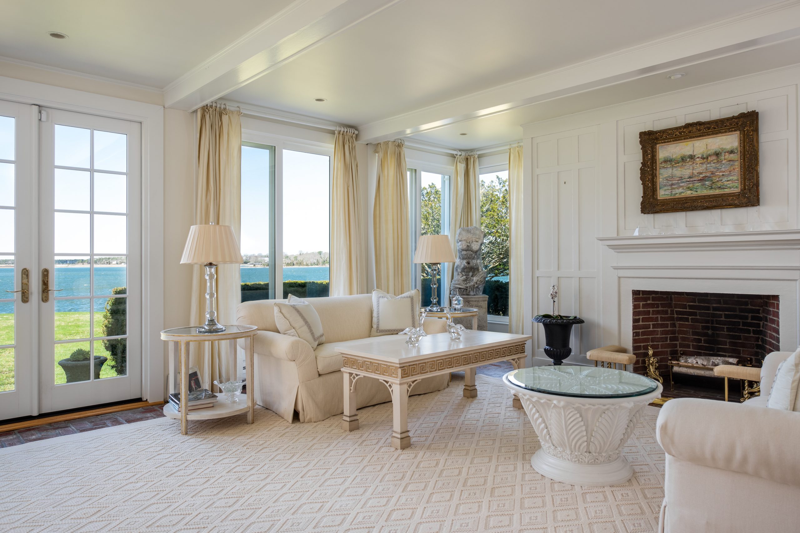 . In the east-wing of the house is a stately living room with lovely built-ins and a Dutch door opening onto a cozy sunroom overlooking the bay, lawn, and swimming pool.