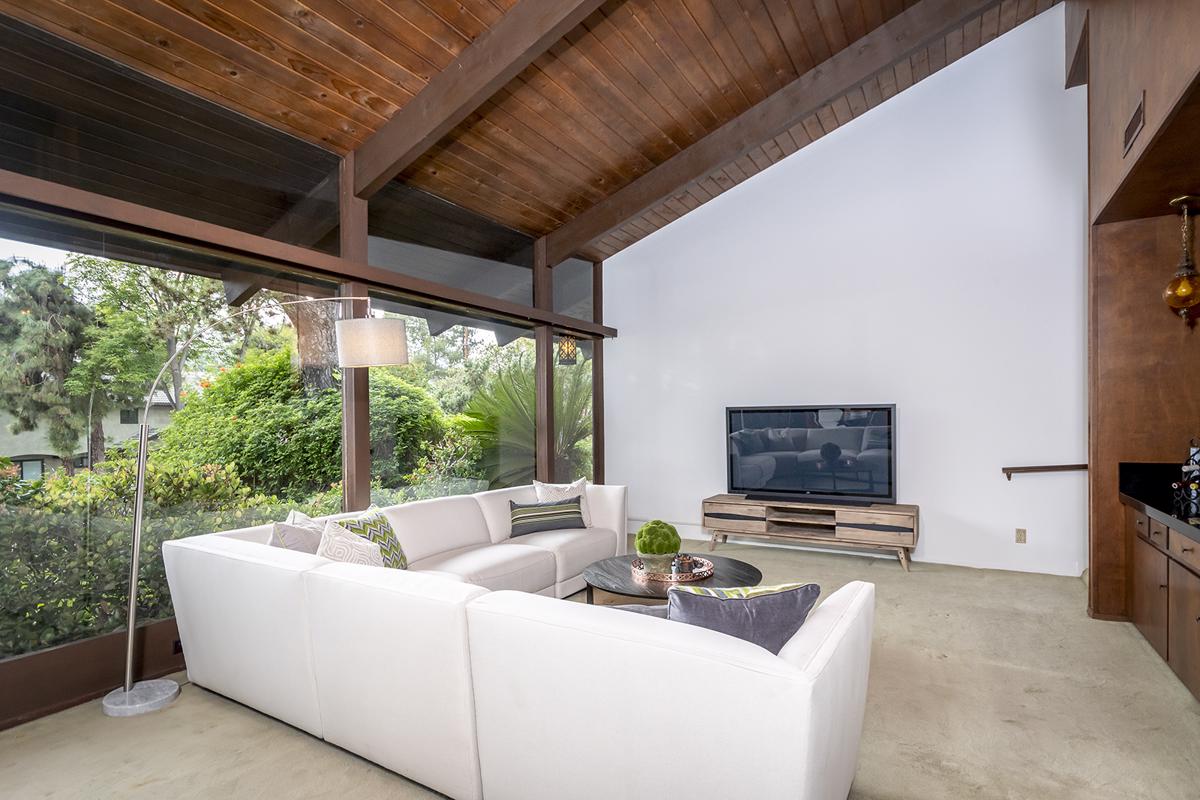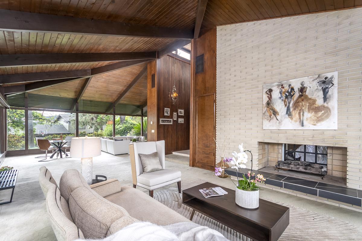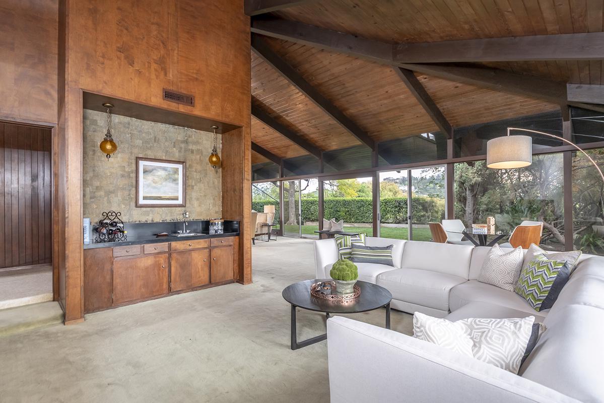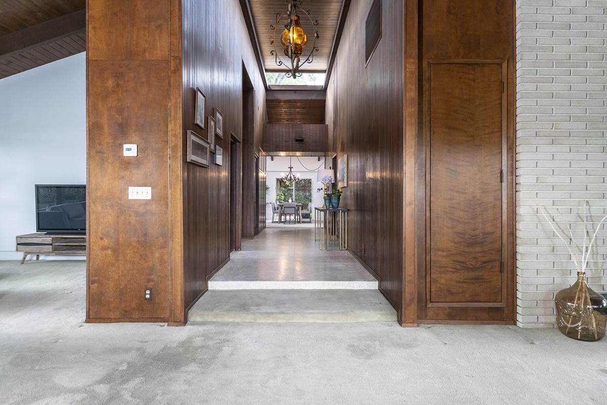 As you approach the property, you will be struck by the geometric lines and glass panels that characterize these Mid-Century treasures. A natural wood-paneled entry and hall welcome you, accented with terrazzo flooring and illuminated with extensive clerestory windows above the 18-foot ceiling.