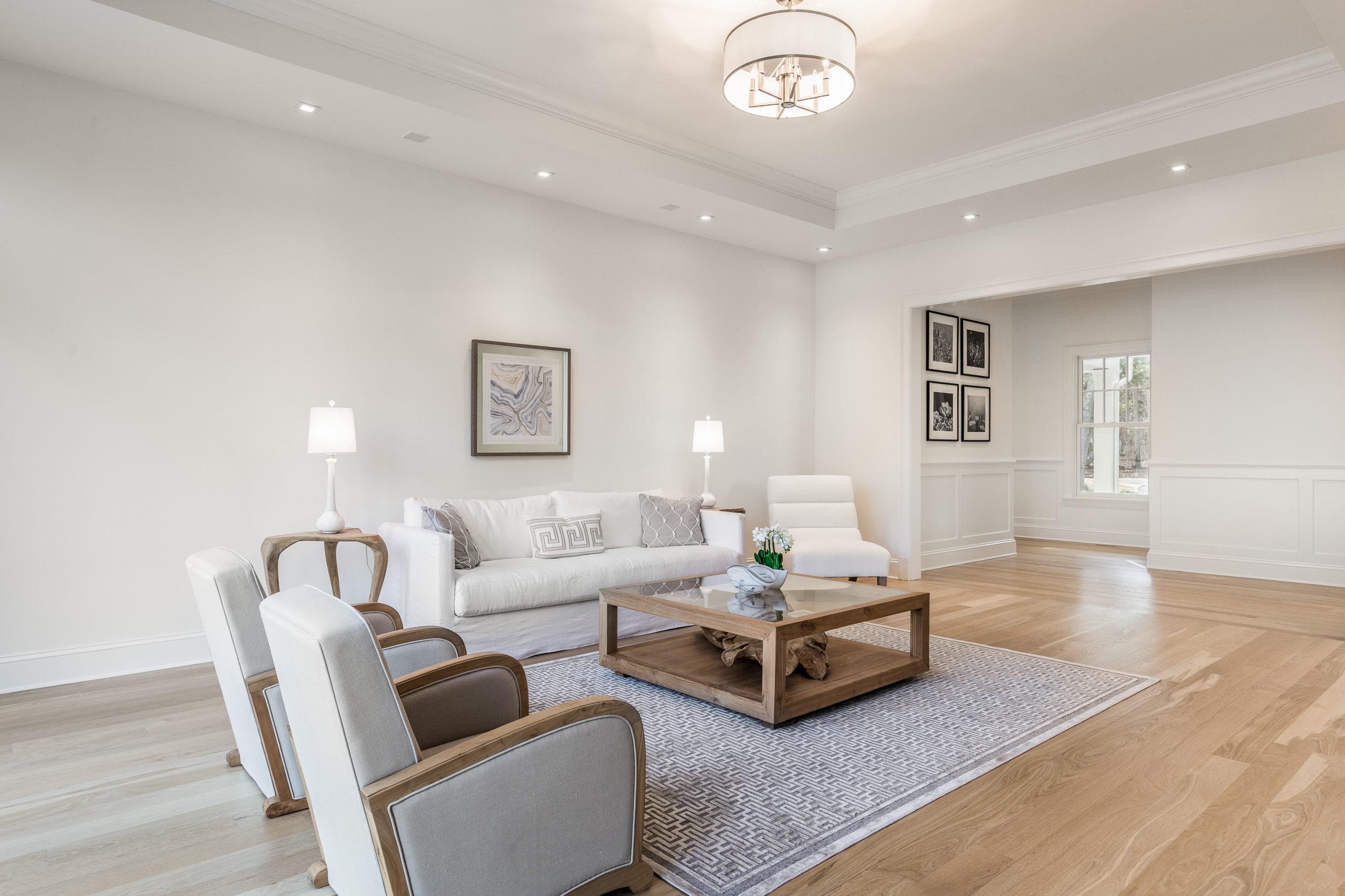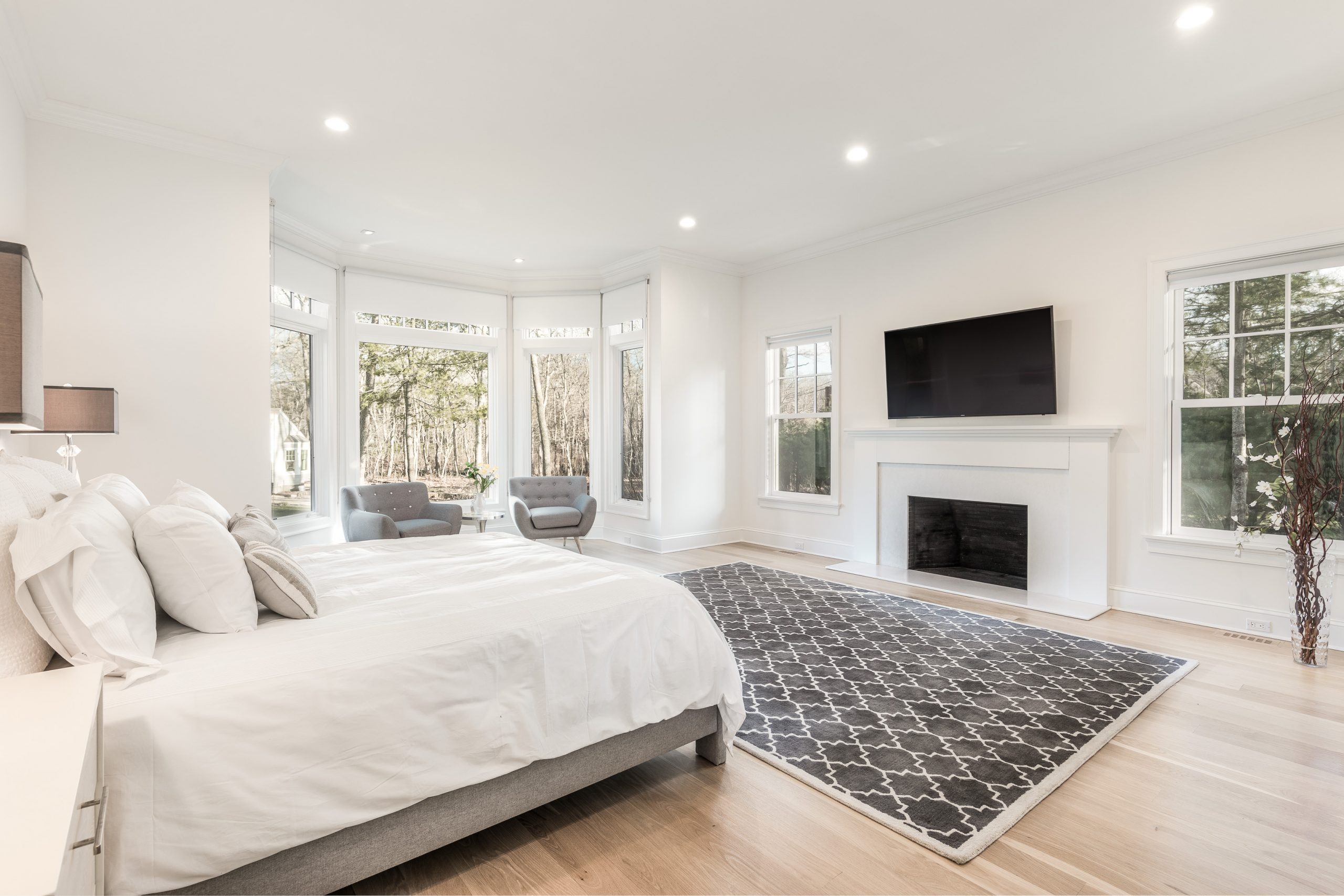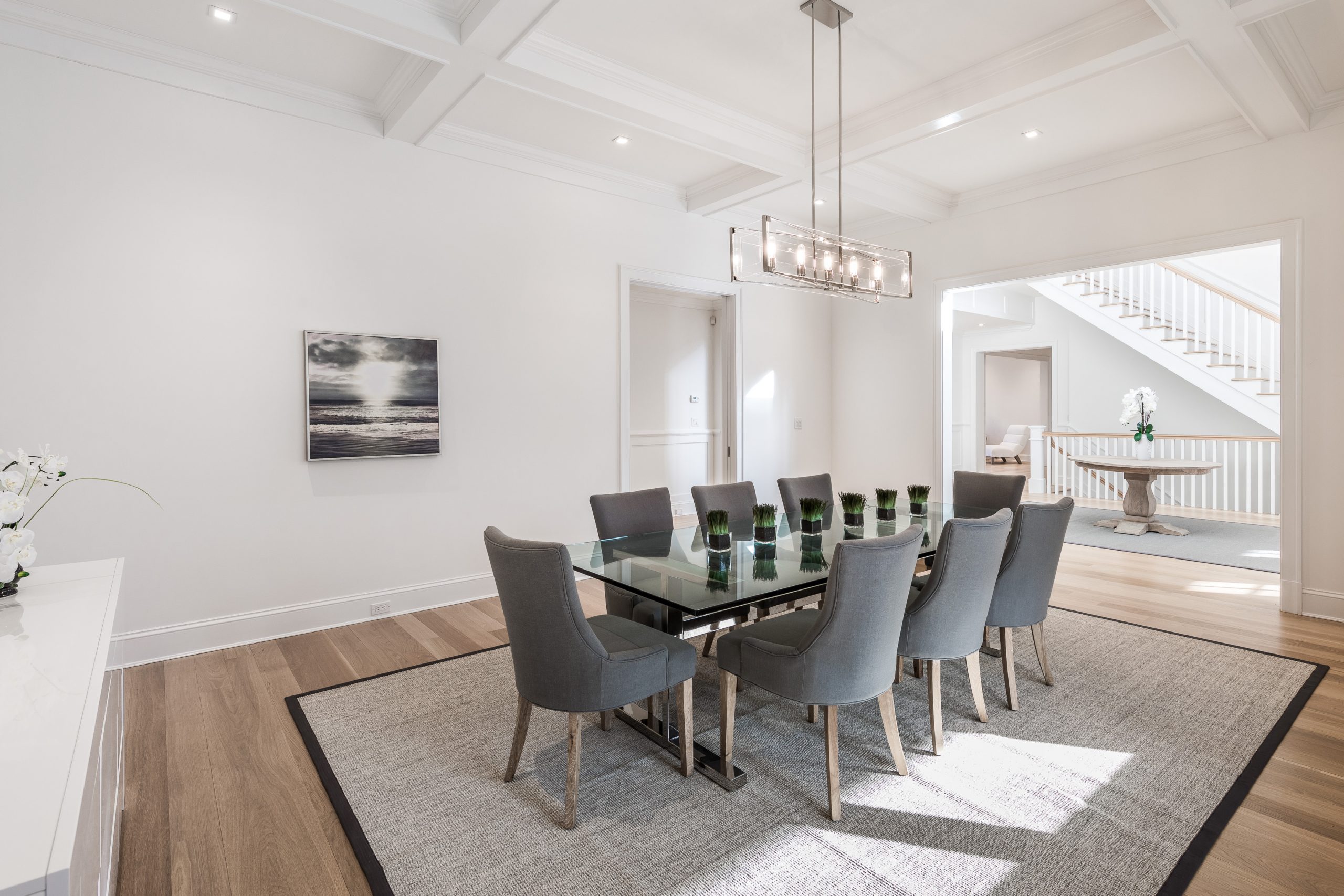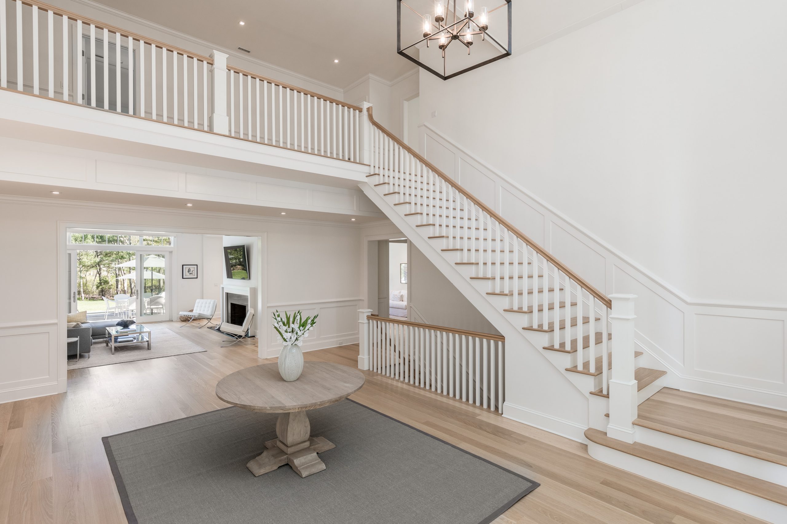 This 9,500-square-foot home was built in 2016 and has clean architectural lines. There are a total of seven bedrooms with plenty of room for summer guests. White walls and light hardwood floors help maximize the sense of light and spaciousness.