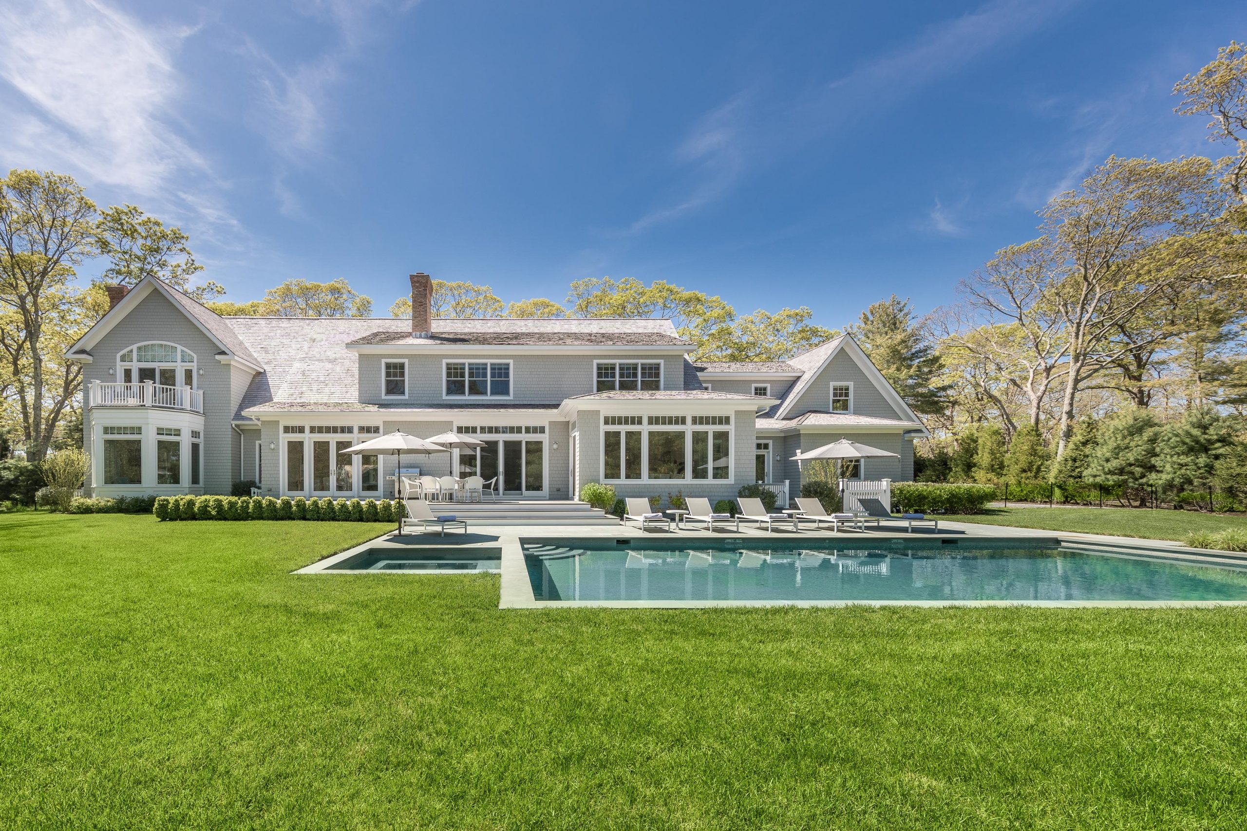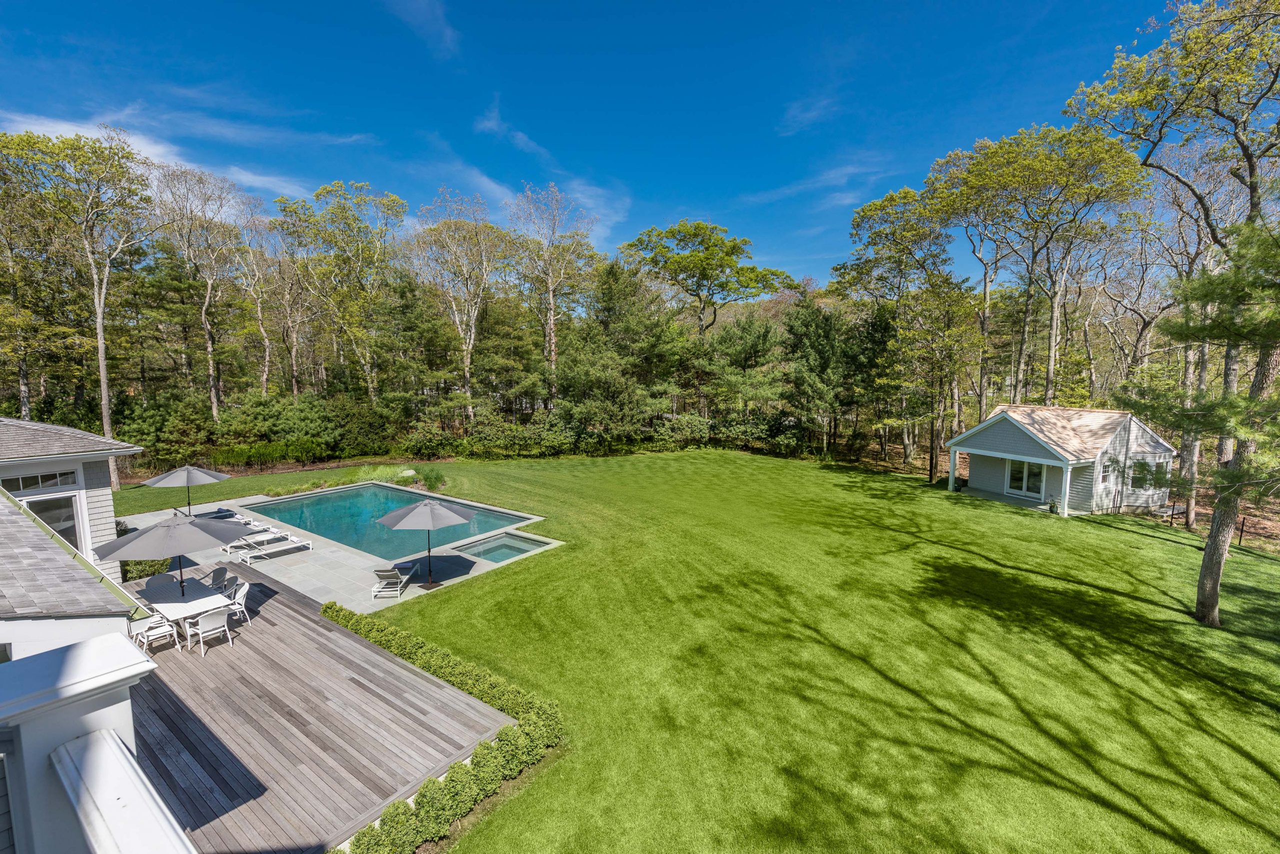 Outside, a lush lawn surrounds a blue stone framed heated gunite pool and spa.
