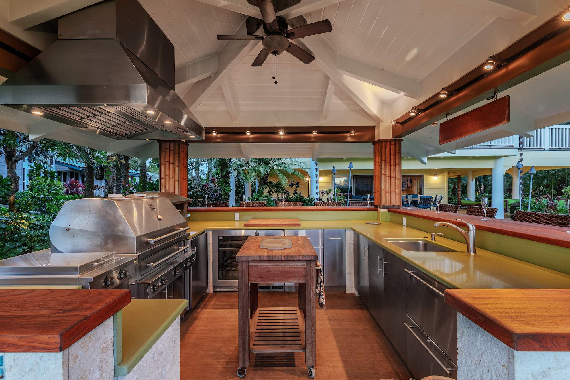 An airy screened-in lanai, with a hardwood dining table set as its centerpiece, forms an idyllic gathering place for intimate dinner parties overlooking the ocean.