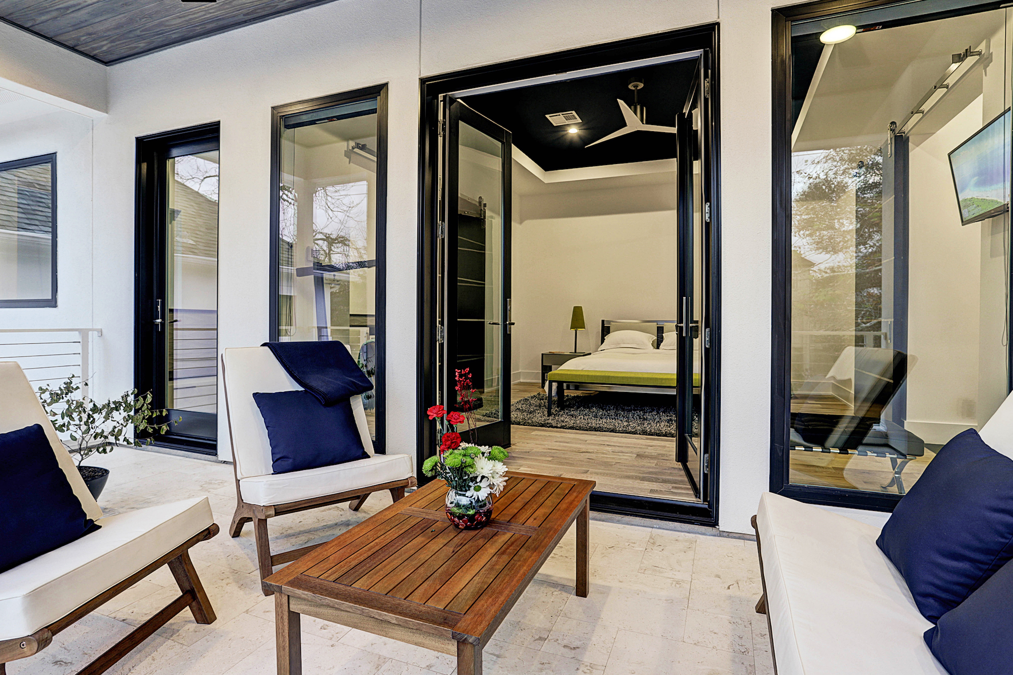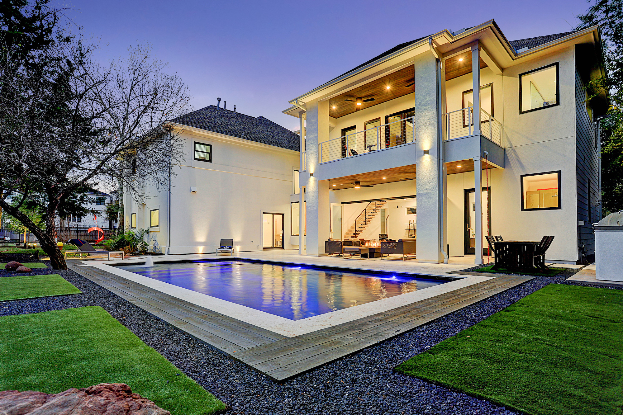 Custom mahogany and stainless doors repeat in the entry, garage, living room, and in the large owner’s retreat, which features white oak floors and access to a sweeping travertine balcony mirroring the patio/pool below. The owner’s bath offers freestanding tub, oversize shower and deluxe closet. A full second retreat could serve as a gym/flex space. Symmetrical secondary bedrooms feature chestnut floors.