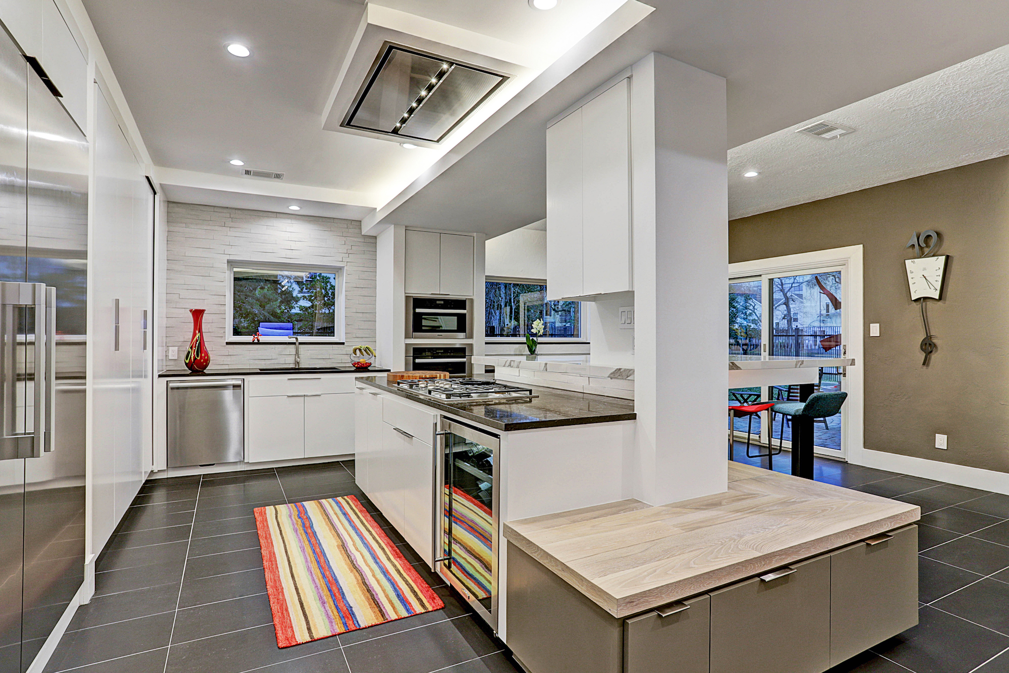 Consisting of two wings joined by a floating walkway, the home is unified with thoughtful threads of continuity. In the living area, accordion glass doors open to combine the interior and exterior spaces. In the kitchen, marble and stone counters contract crisp white cabinets and stainless appliances. Large windows run the height of the soaring two-story ceiling in the dining room.