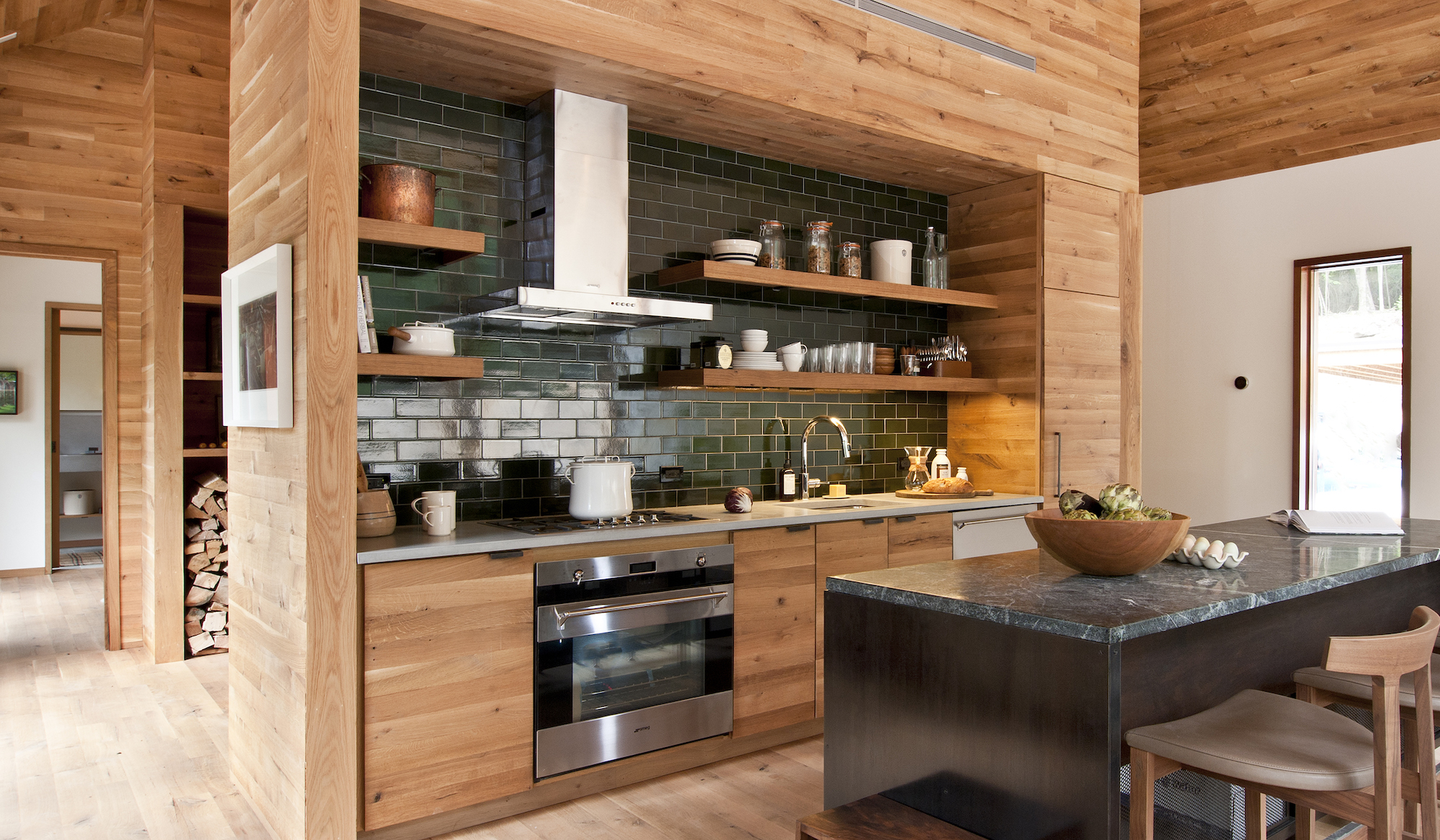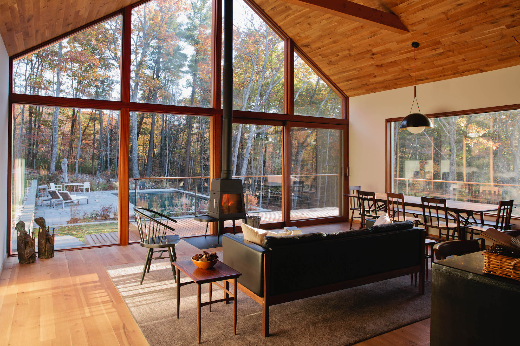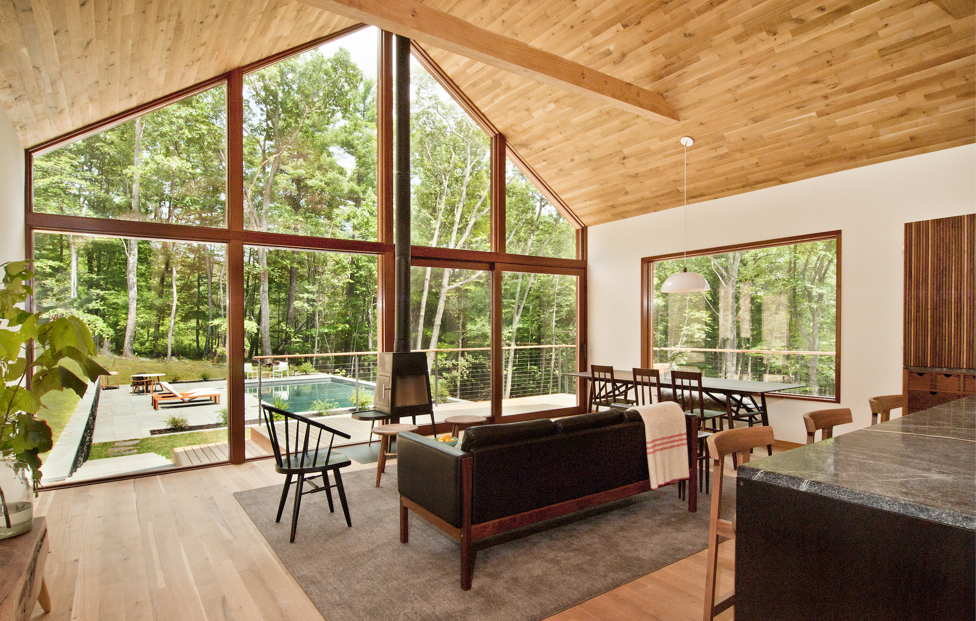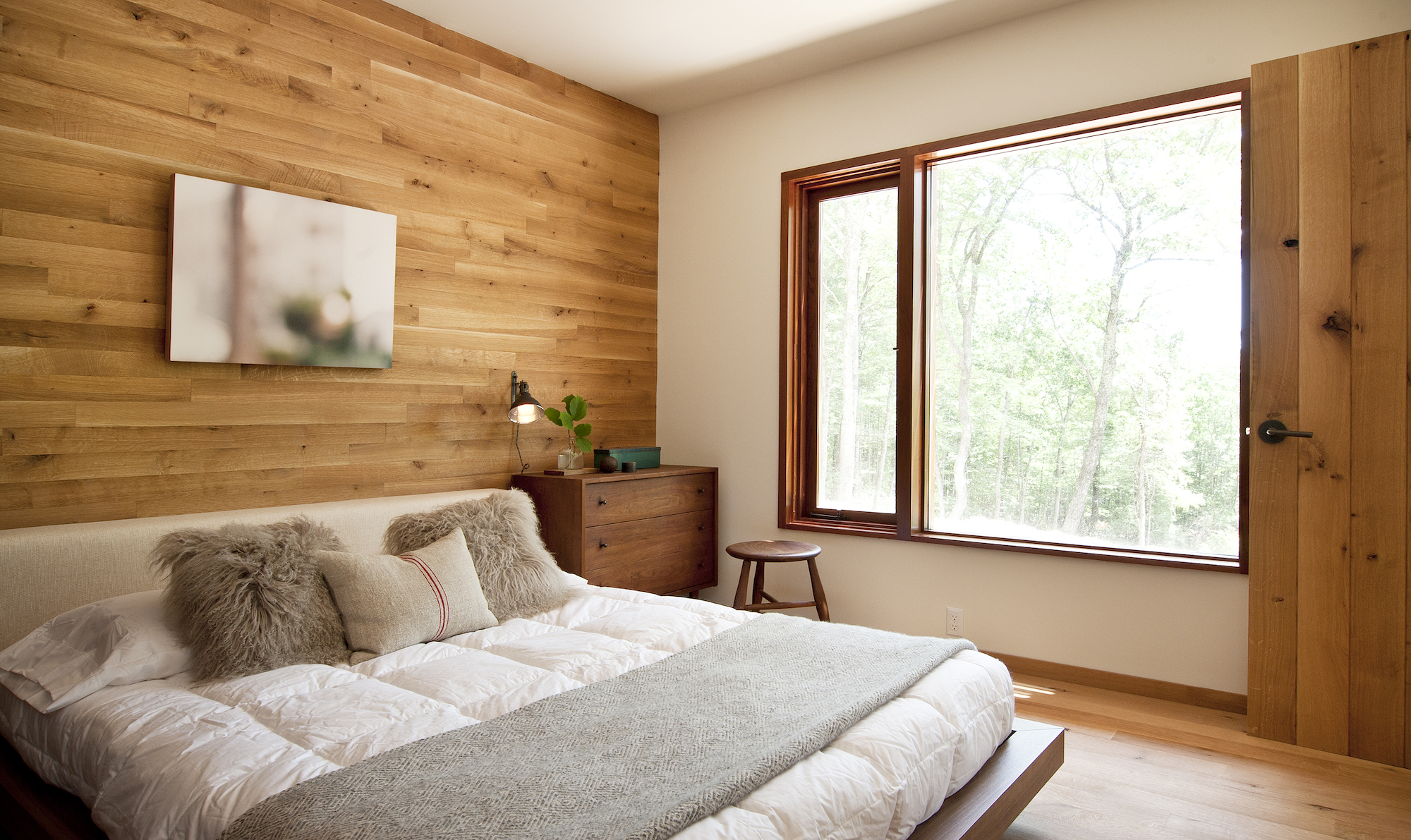Imbued with a contemporary aesthetic that is common throughout the region, Lang designed the cabin with an open-plan living and dining area and a master suite on the upper story. Two bedrooms and a den are situated on the lower level, and walls, ceilings, and flooring are sheathed in white oak sourced from a small, family-owned mill in Pennsylvania.