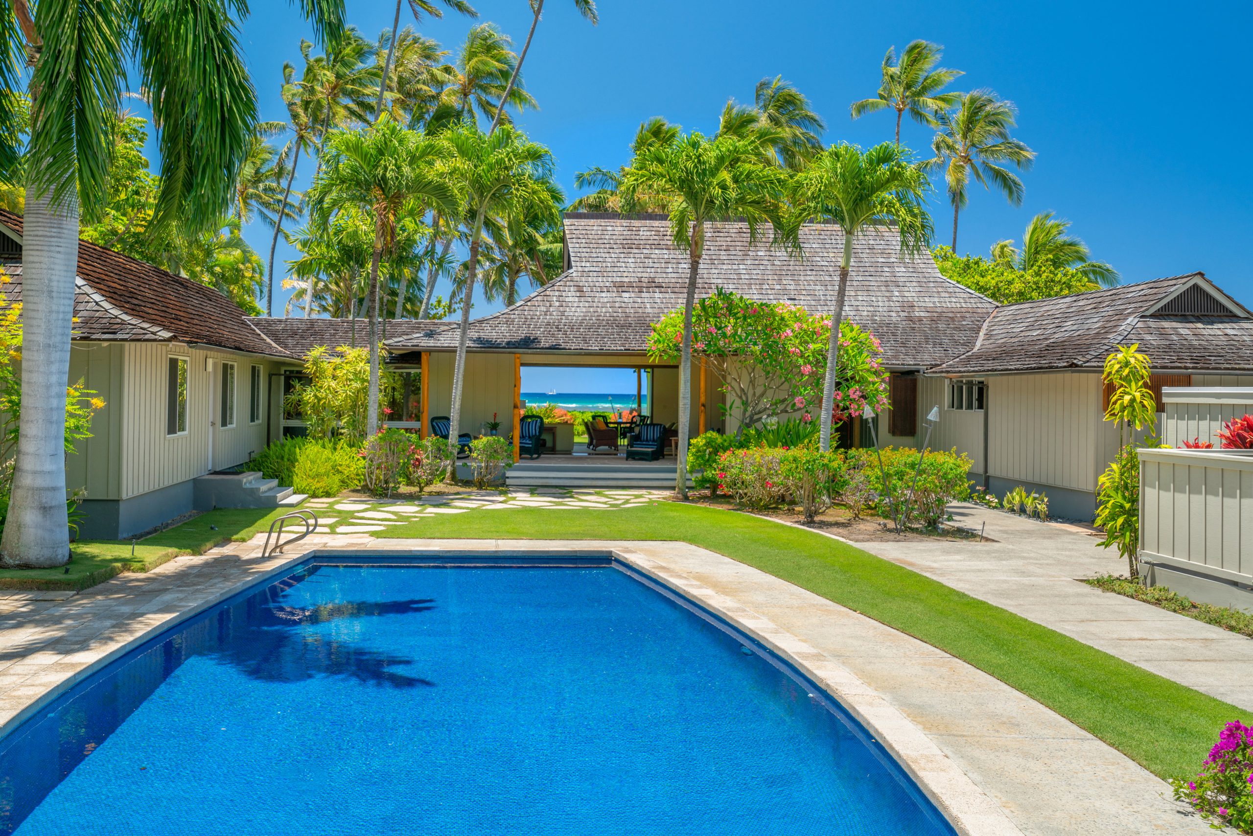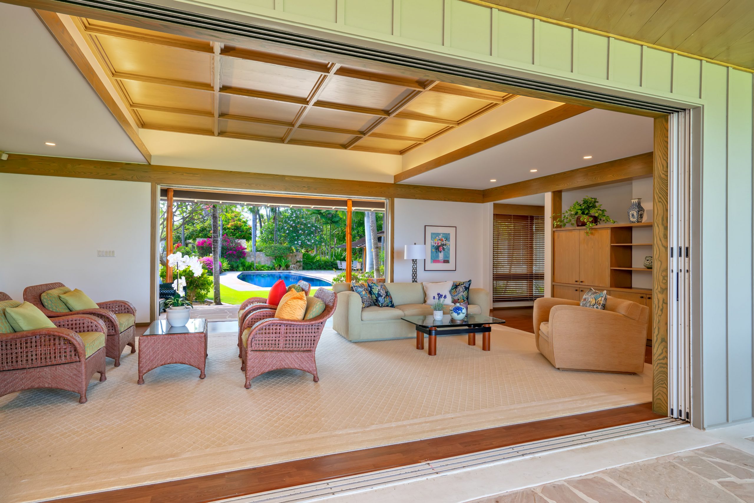 The living room frames the picture-perfect ocean view and opens to lanais on both sides – step out to the oceanfront yard or out to the pool.