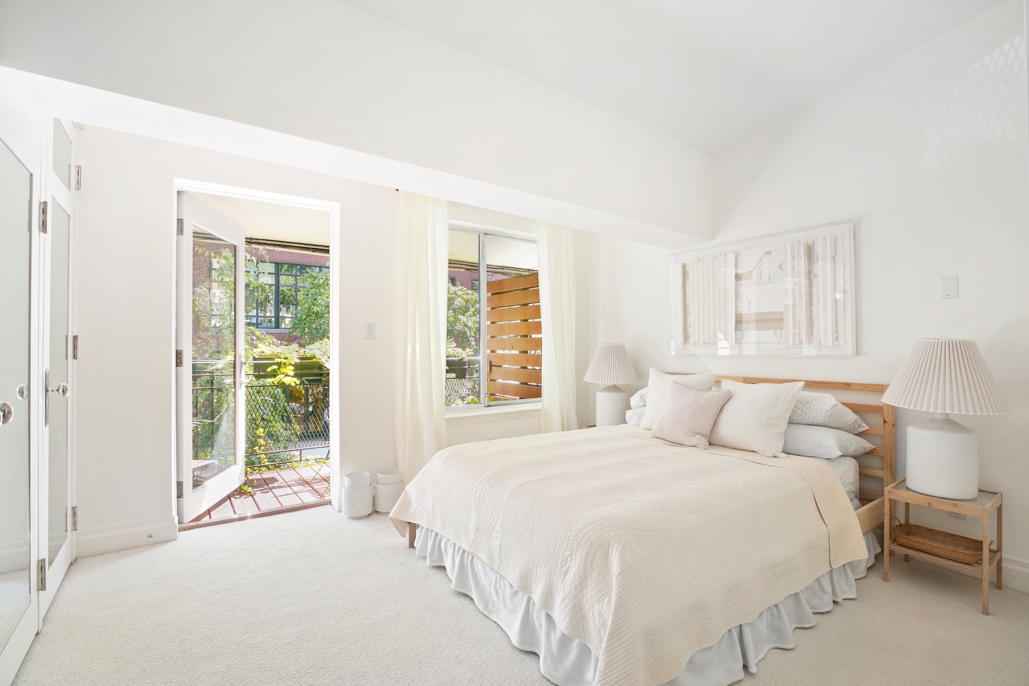 The south-facing master bedroom enjoys sunny treetop views over Charles Street and has access to its own private terrace. An entire wall of floor-to-ceiling custom closets have been added for storage.