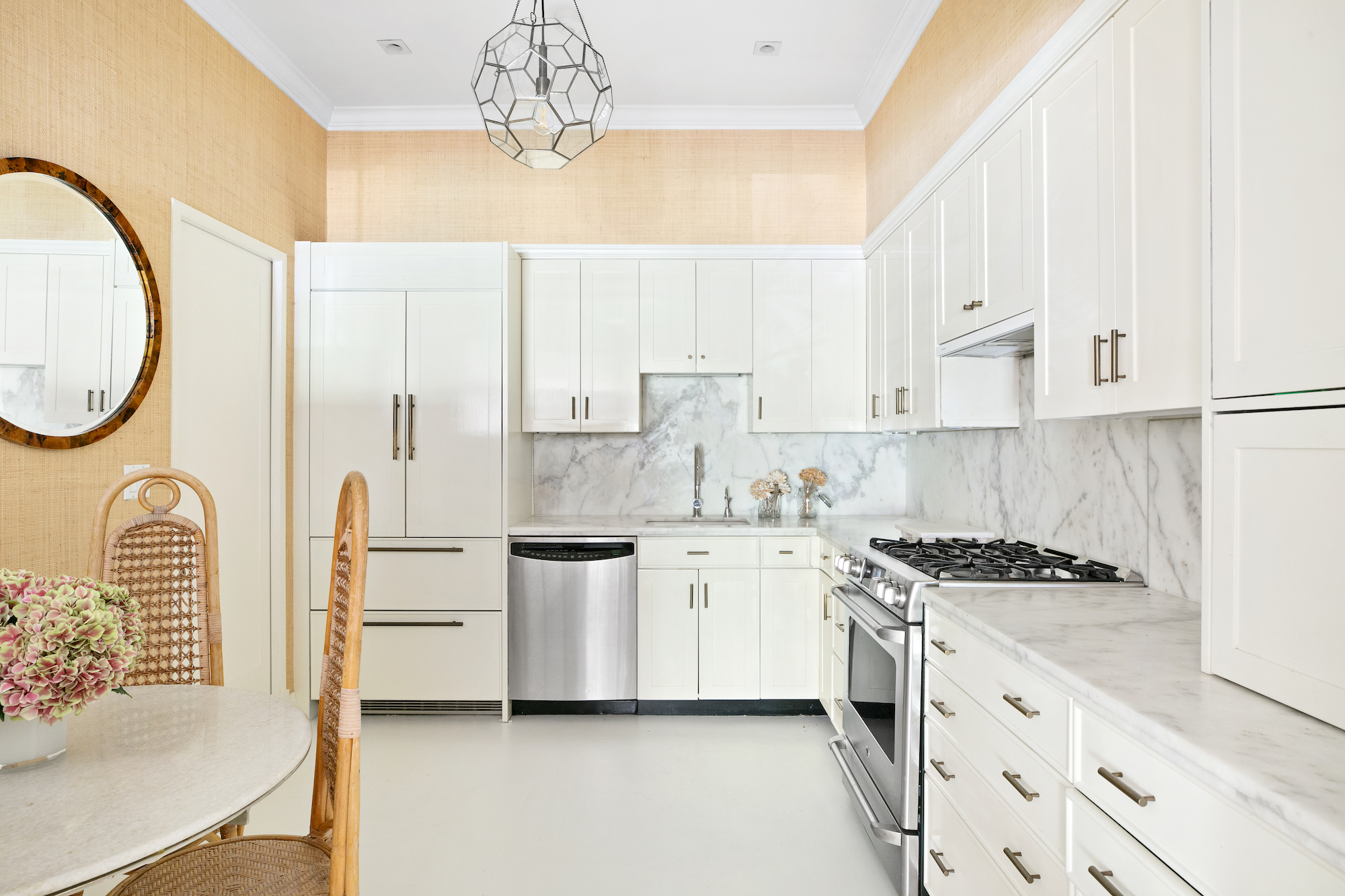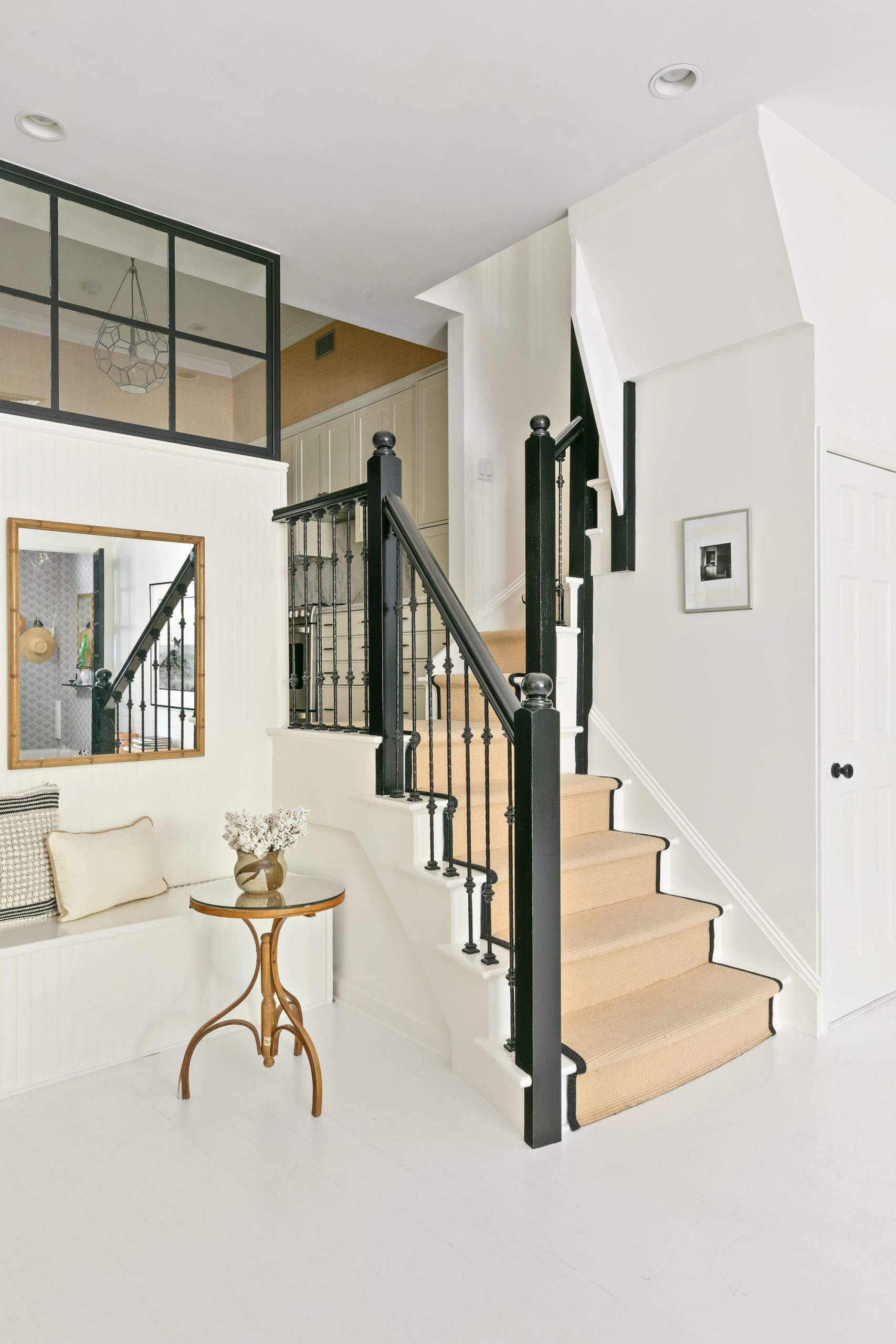 A short stair leads up to a beautifully renovated eat-in kitchen with breakfast nook and a full secondary bathroom.