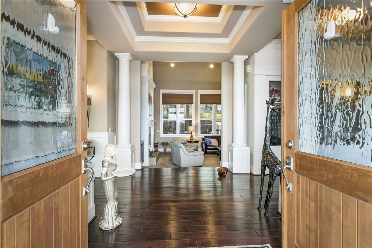 Enter to hand scraped walnut floors, classic pillars, and a floor-to-ceiling lighted wine cellar.