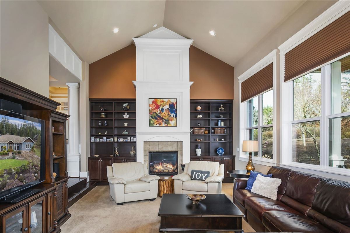The stately great room has soaring vaulted ceilings is anchored by a propane fireplace. The ceiling height mantel is flanked by custom bookcases, perfect for displaying your treasured collections.