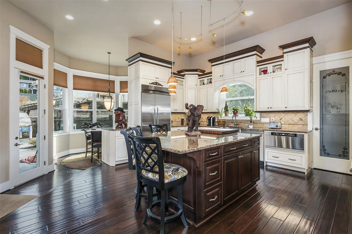 The gourmet kitchen offers a dreamy place to create delicious memories. It has professional grade stainless steel Thermador appliances, a commercial grade ventilation hood, and a Daccor drawer microwave. Granite countertops, and custom cherry Pacific Crest cabinetry with soft close doors and drawers. The kitchen also includes a walk-in pantry, center island with bar seating, convenient pot filler faucet, and a charming apron sink.