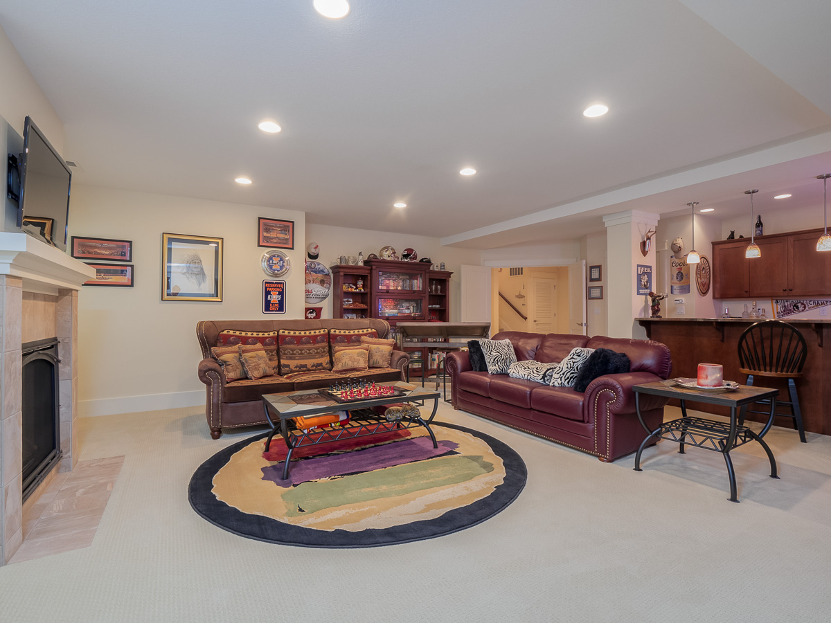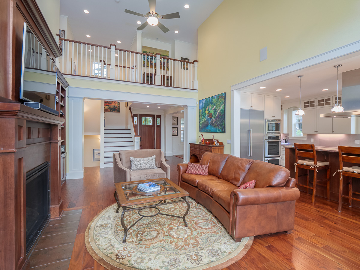 The home’s open floorplan includes vaulted ceilings and hardwood floors. There are four fireplaces total.