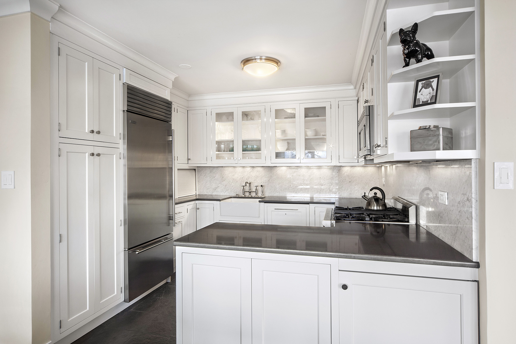 The compact kitchen is highly functional, with high-end appliances and plenty of counter space and cabinetry.