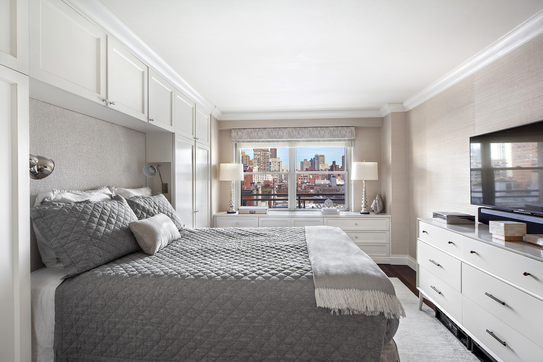 On the west side of the apartment is the master suite which includes a large bedroom with northern exposures, a double-vanity master bath and plenty of custom built-in storage space.