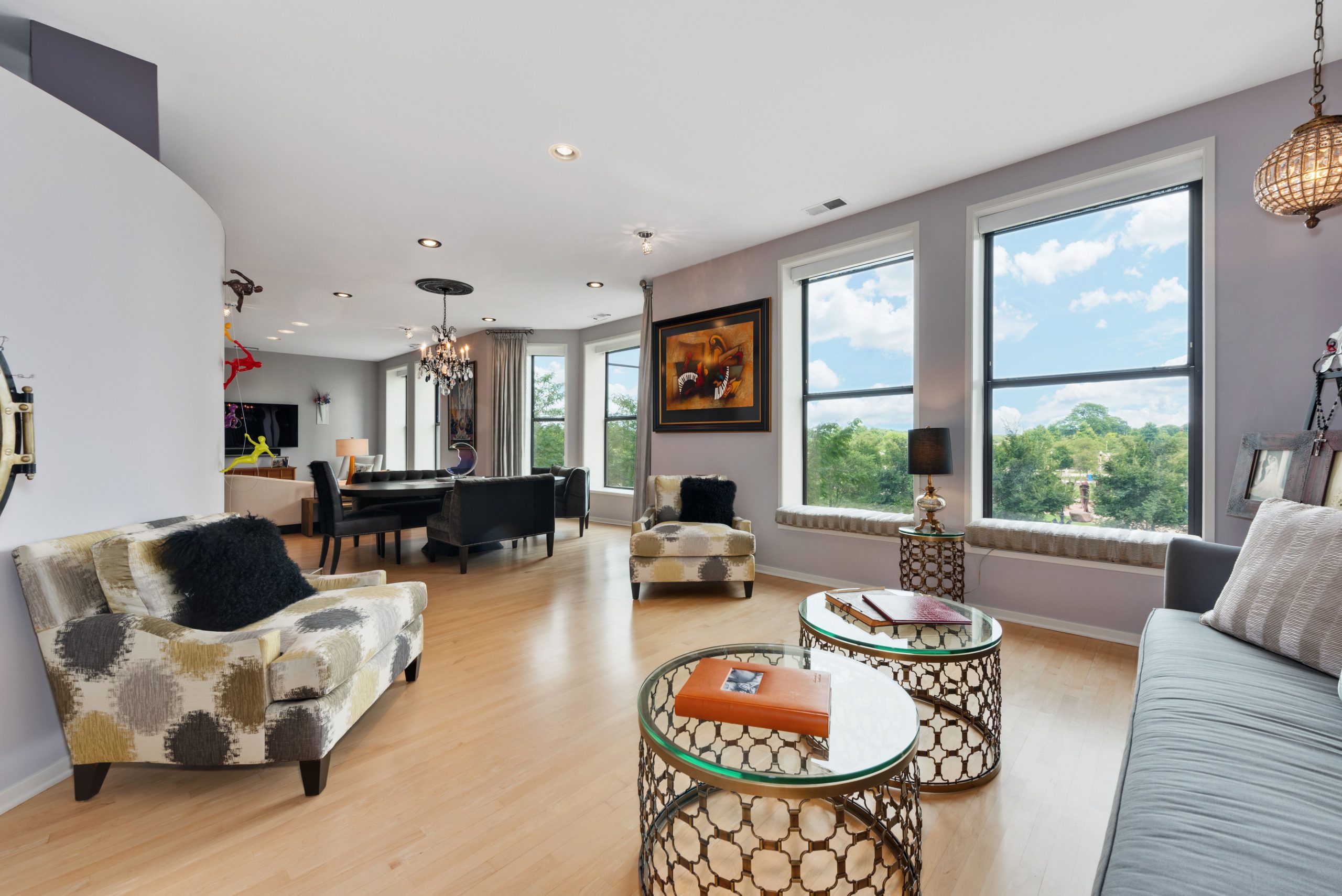The finely finished living space has oversized windows and motorized blinds. The family room/dining room, and living room overlook Grant Park and Lake Michigan.