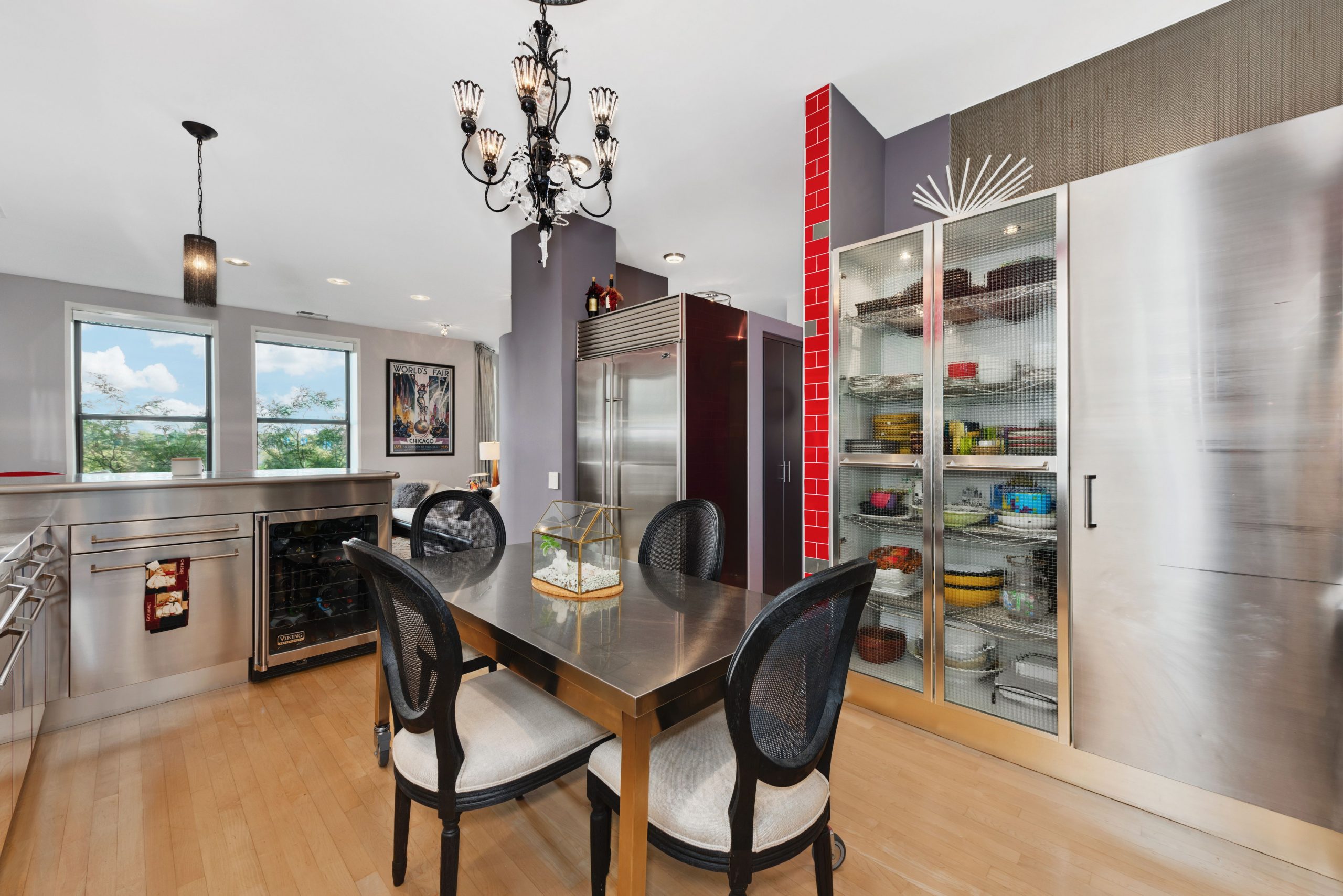 The sleek stainless steel kitchen offers Viking and Sub-Zero appliances, tons of cabinet and counter space.