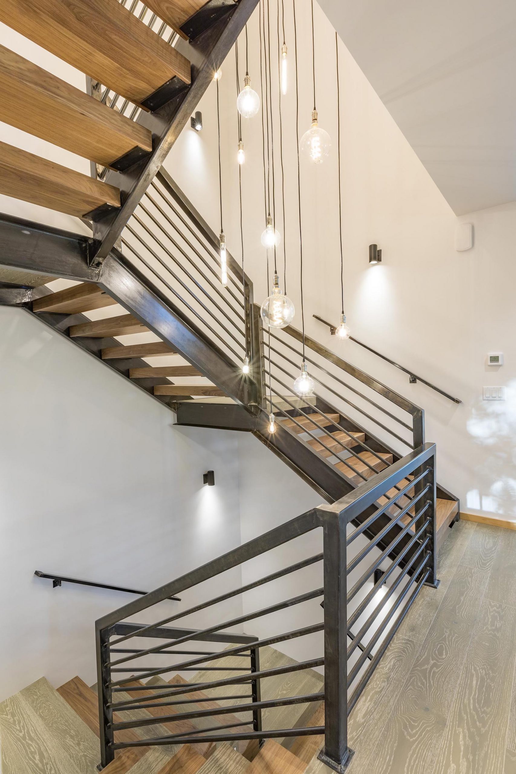 A custom 16-foot chandelier hangs down through the wraparound custom-carpentry staircase across all three floors.