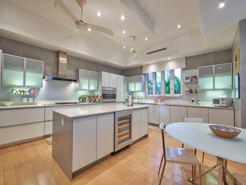 The ultra-modern Schiffini kitchen has glass cabinets, a Wolff stove and a Sub-Zero fridge/freezer.