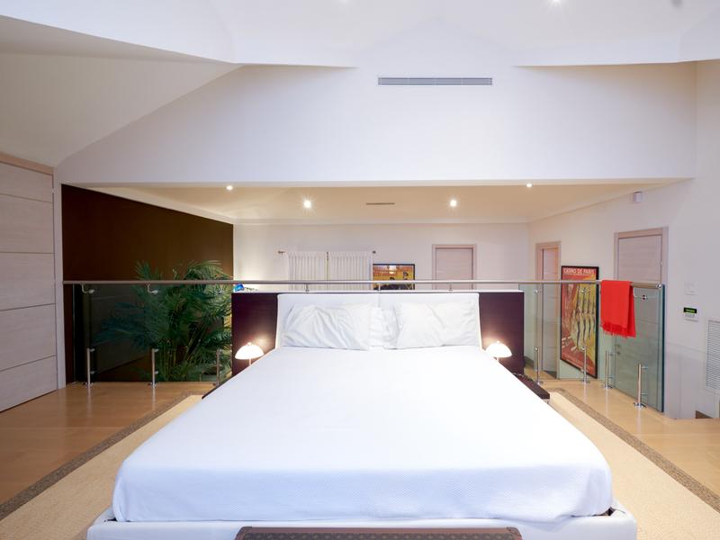 An impressive guest suite accessed by a glass Faraone designer staircase has a large sitting room with a separate mezzanine style sleeping area.