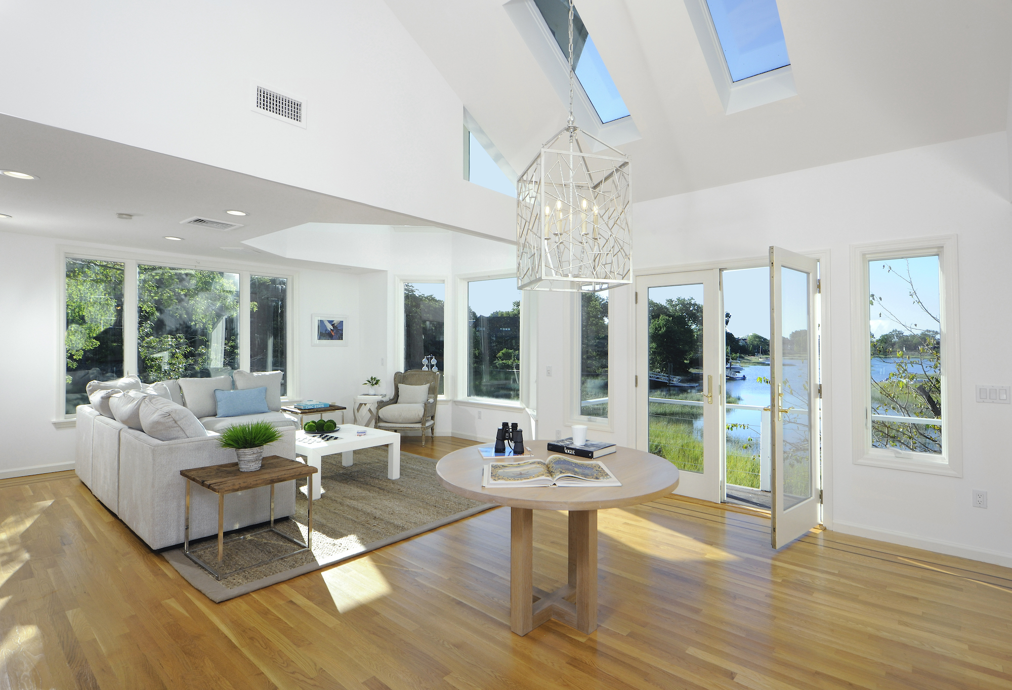 This home is surrounded by water on three sides, with a private dock leading to Long Island Sound.