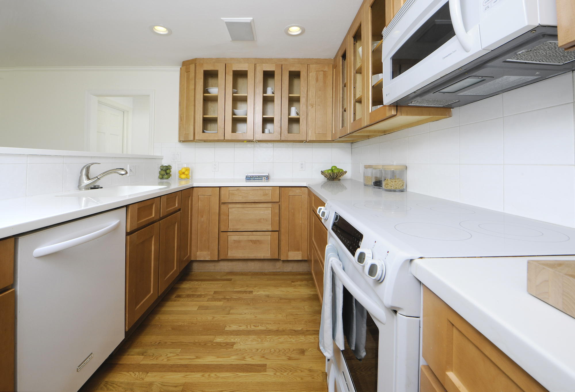 The kitchen with a sitting area leads to a terrace overlooking the water.