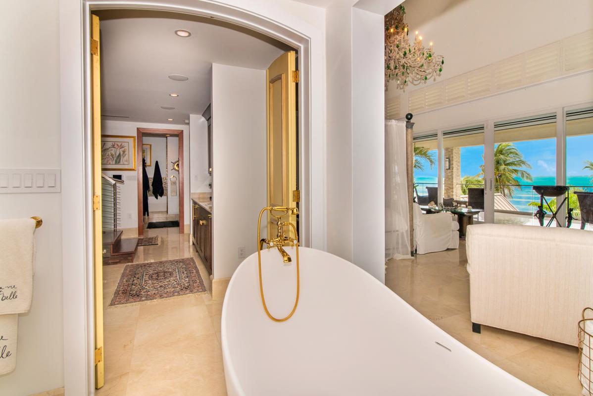 The suite has dual bathrooms and a full closet with its own private stairs to the mezzanine level of the master suite. The house has a resort-quality elevator, office, utility and laundry rooms and extensive storage throughout the home. Hurricane-rated doors and windows enhance not only views but security too.