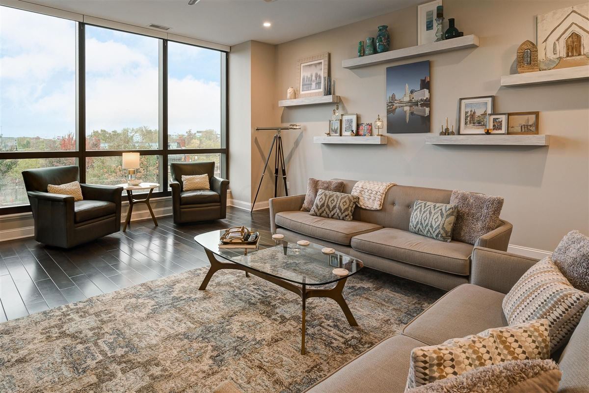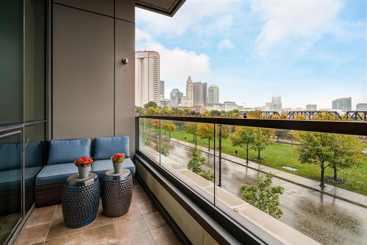Enjoy spectacular views of the Scioto River and Downtown skyline in this third-floor condo in Arena District, loaded with luxury amenities.