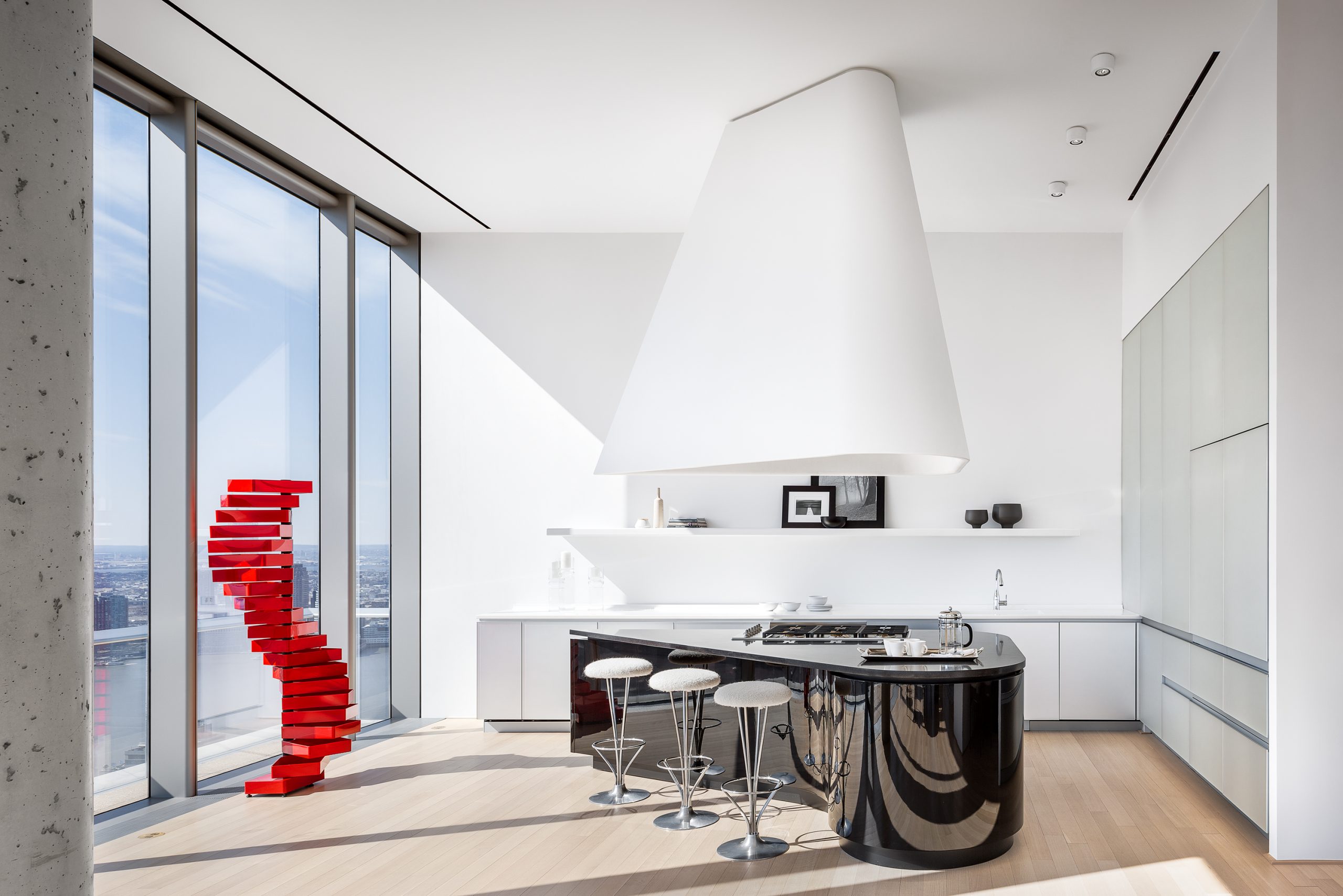With custom exterior and interior design by Herzog & de Meuron, it has been compared to a glass villa, free-flowing much like a California modernist house in the sky, with 14′ ceilings and 14′ foot window walls in every room. The open kitchen features a sculptural Absolute Black granite grand piano shaped kitchen island with custom-sculpted floating vented hood cover
