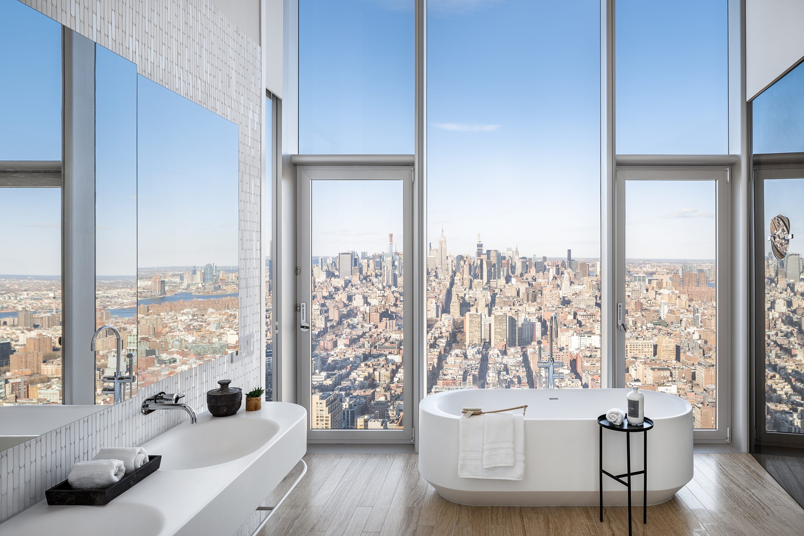 Views in all four directions of New York span river to river and as far as the Atlantic Ocean, the spires of midtown, the iconic downtown skyline and over a dozen bridges. Forming an axis, the highly unique skyline view gallery offers uninterrupted views to the north/south/east/west from a single center point of the home.