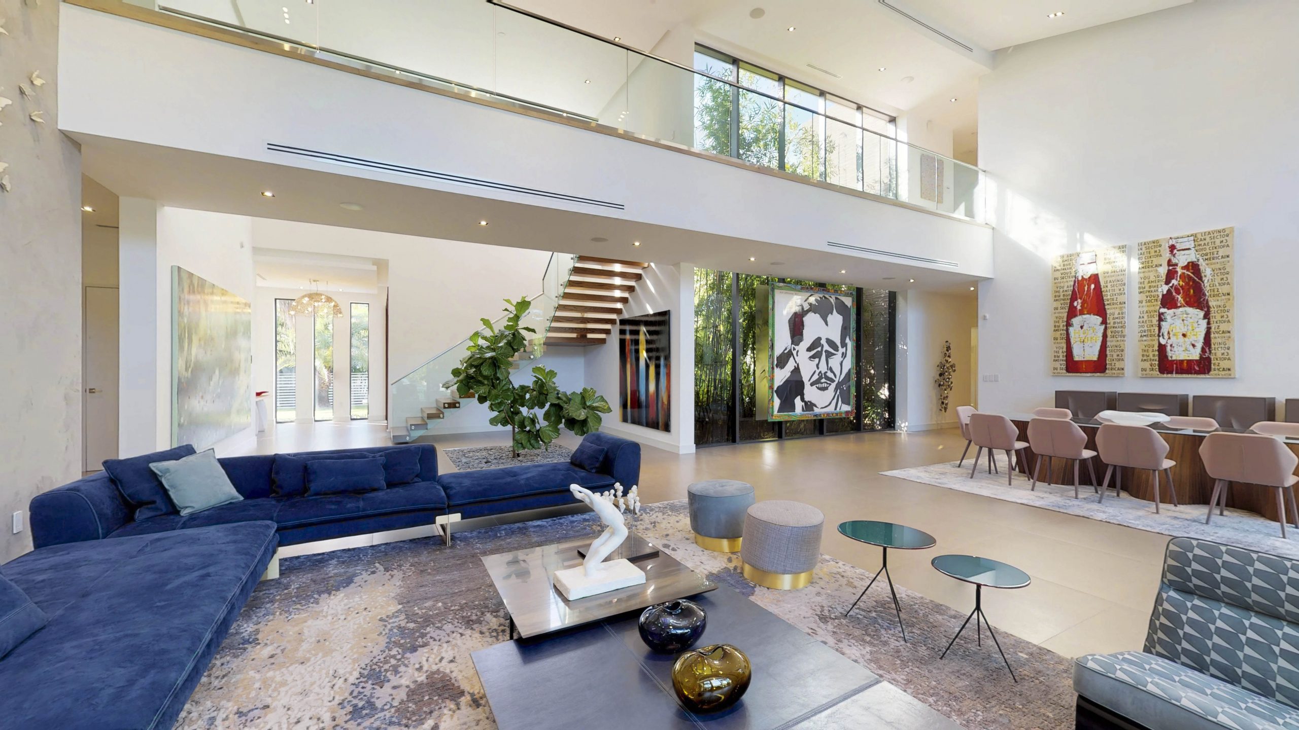 Outfitted with state-of-the-art smart-home technology with 20 security cameras, 24-foot ceilings, floor-to-ceiling impact windows, the home has a variety of luxury features including a seven-seat home theater and a private elevator.