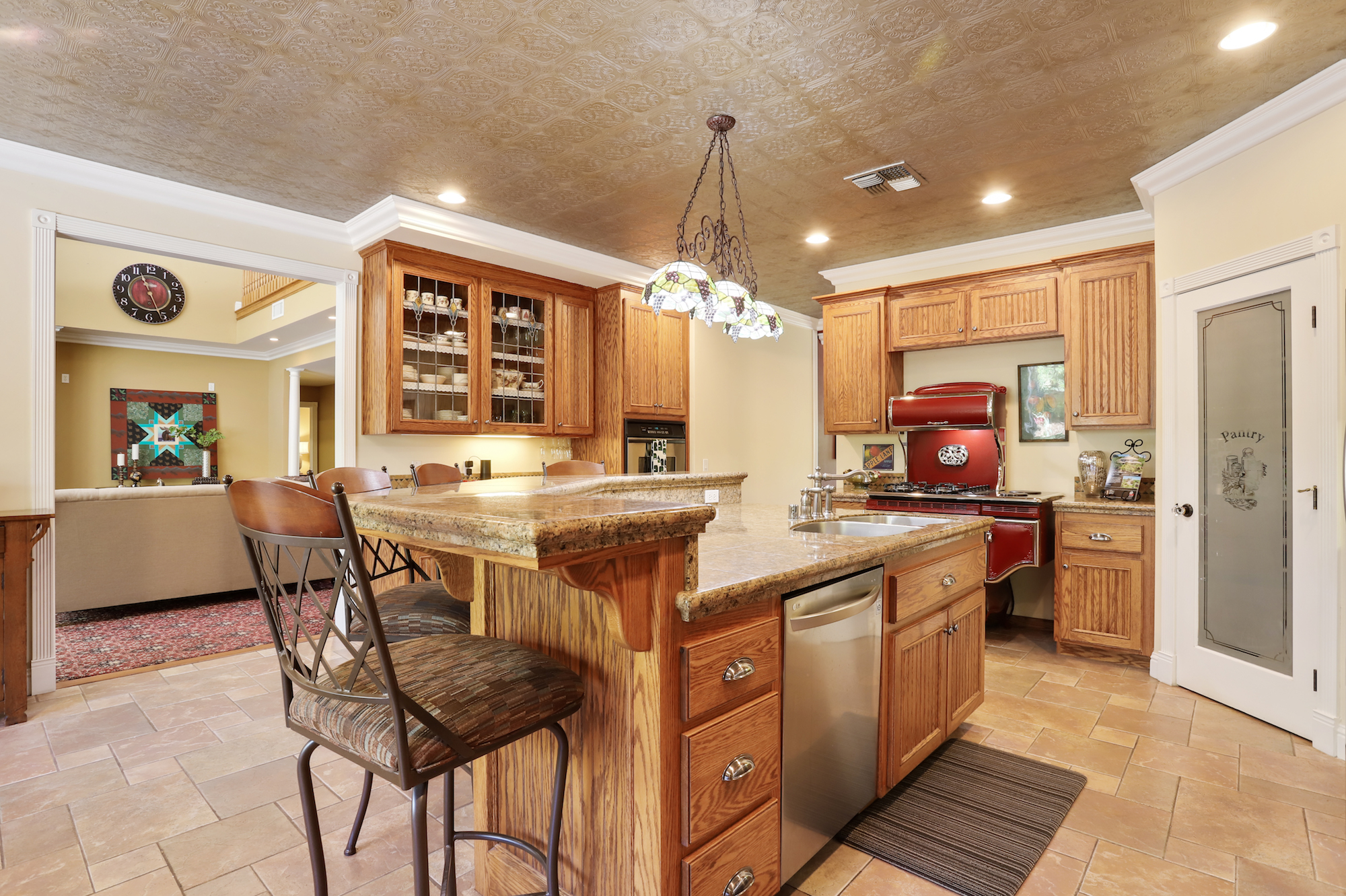 The country kitchen has an island, breakfast nook, and a butler’s pantry.