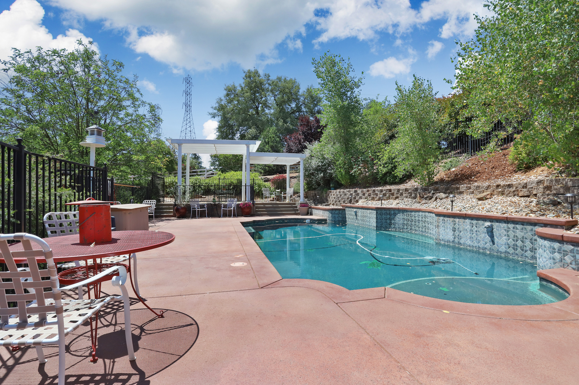The grounds include a fenced pool, gazebo, and a pool house. A large workshop could also be converted into a guest house.