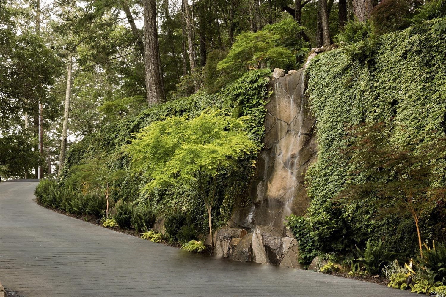 The grounds have strolling paths and hidden statues that peek from amongst the rock walls, as well as a magnificent waterfall, curated forest, and boutique vineyard with distinguished Rutherford Appellation AVA Cabernet vines, which will produce approximately 120 bottles of privately labeled wine each year.